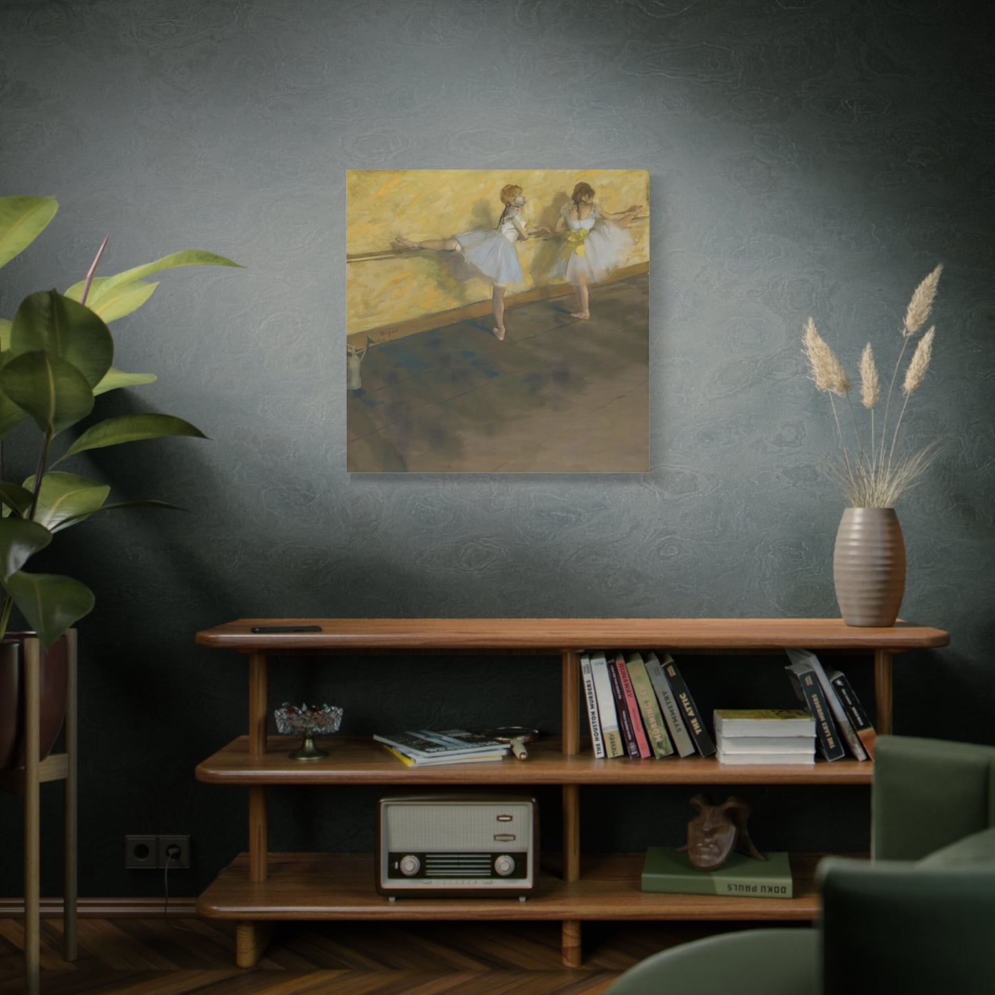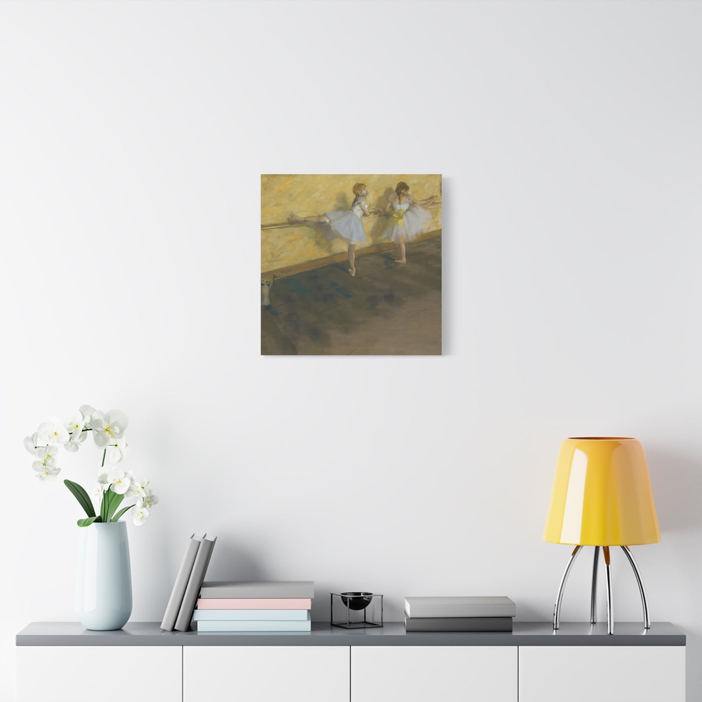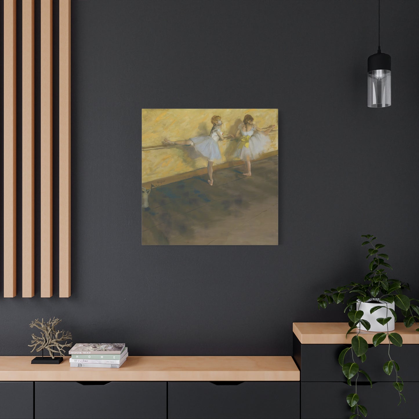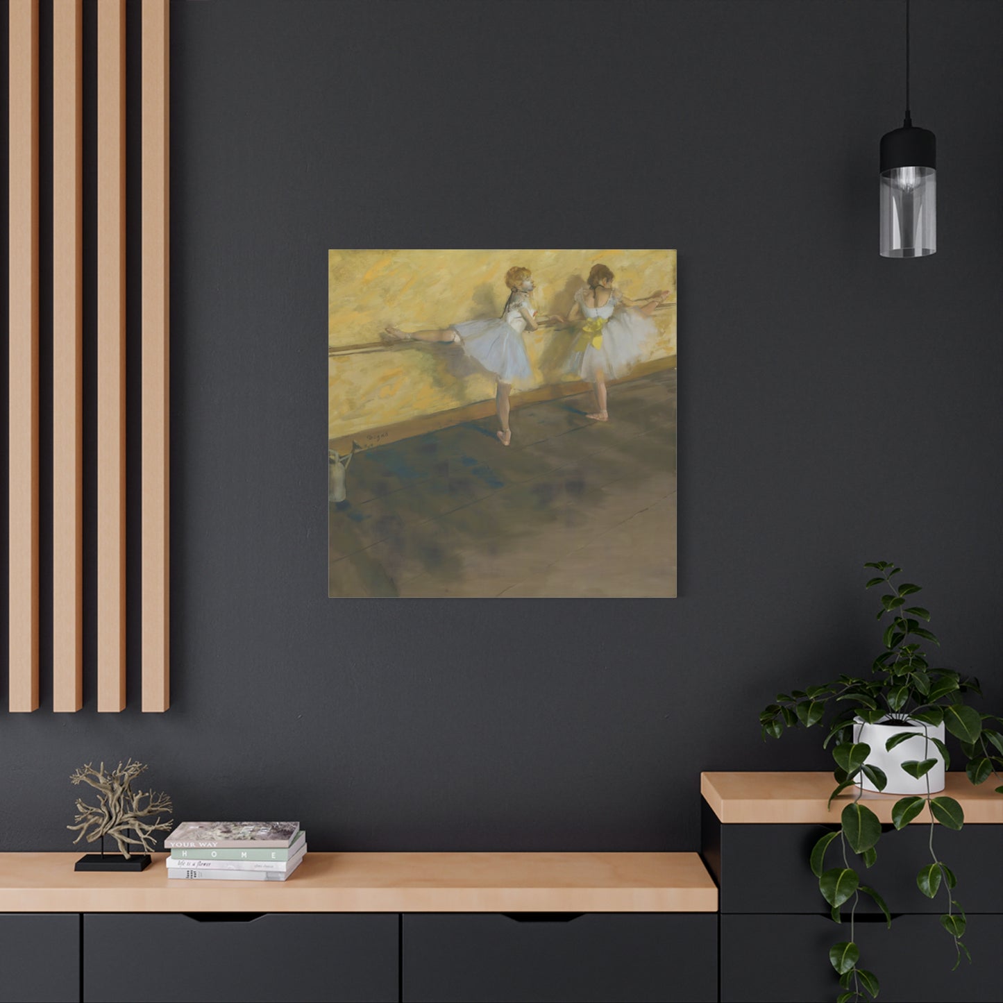 Immerse yourself in the captivating world of ballet with Edgar Degas' extraordinary masterpiece, Dancers Practicing at the Barre. Created in 1877, this enchanting artwork captures the dedication and artistry of ballet dancers as they refine their technique at the barre. Degas' masterful brushwork brings these graceful figures to life, evoking a sense of strength and elegance. With its delicate hues and meticulous details, this artwork becomes a mesmerizing centerpiece that will transport your home to a realm of artistic beauty. Our meticulously replicated canvas art preserves every nuance, ensuring that you can own a breathtaking piece of history that will ignite your passion for dance and infuse your living space with an aura of sophistication. Embark on a visual journey with Dancers Practicing at the Barre and let its ethereal charm captivate your heart and soul.