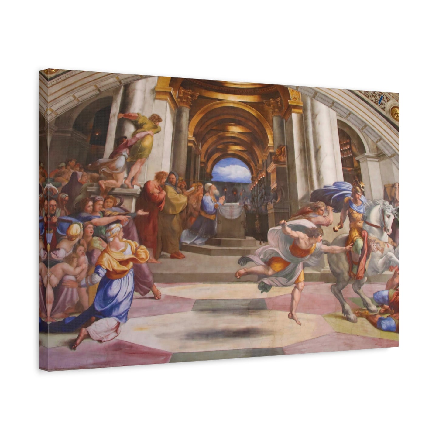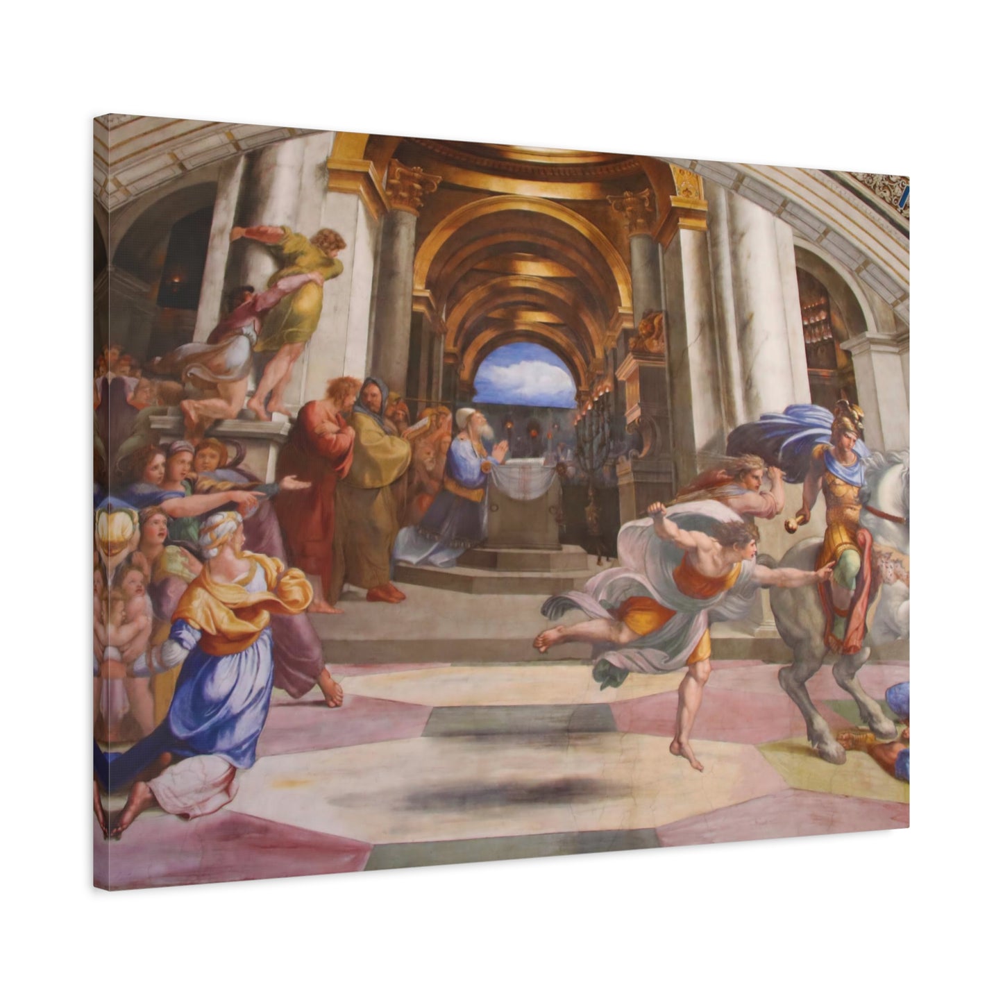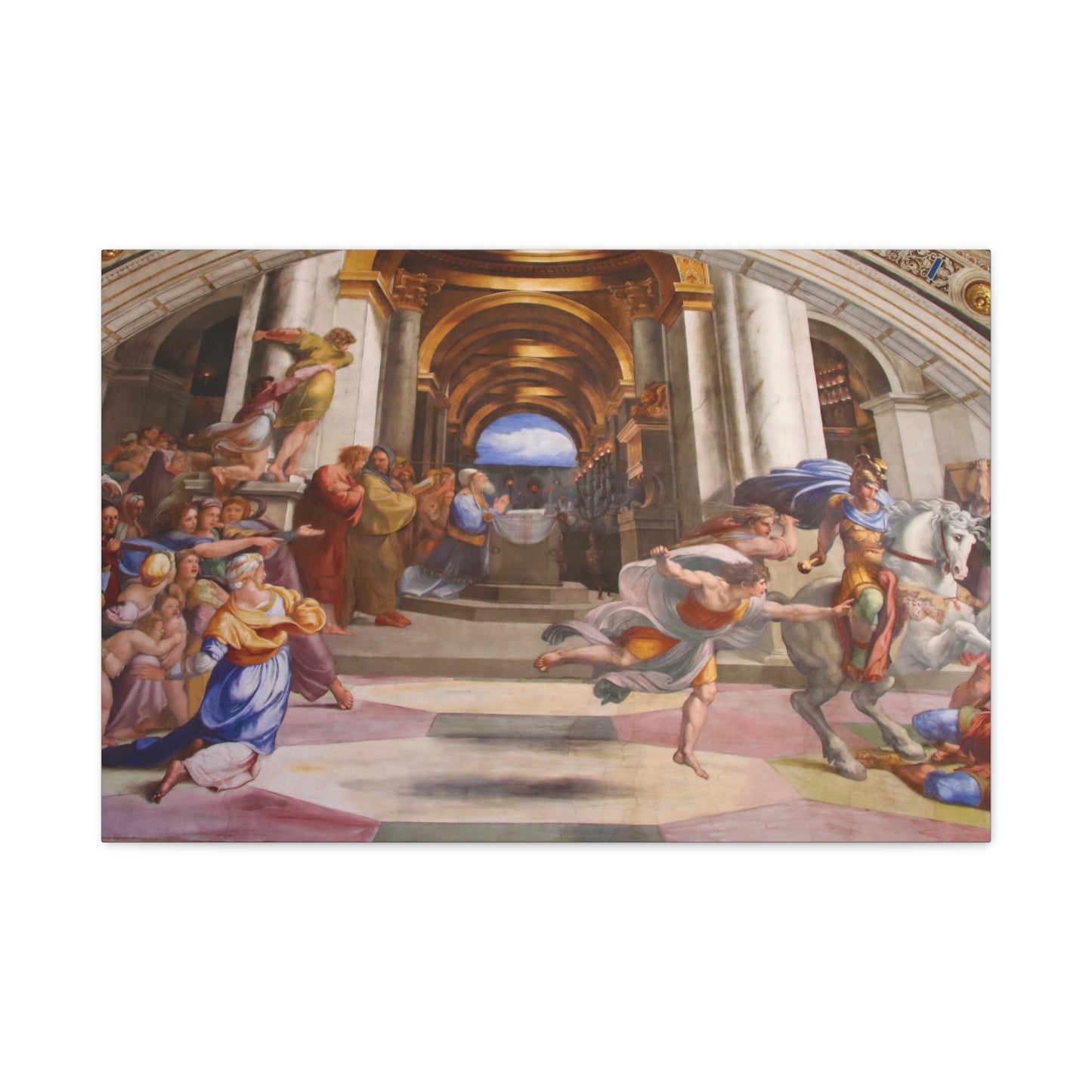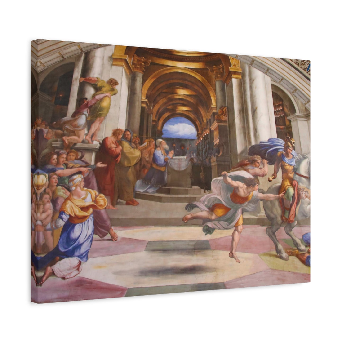 Experience the dramatic intensity of Raphael's Expulsion of Heliodorus from the Temple, created in 1512 as a captivating portrayal of divine intervention. Step into the scene as Heliodorus, a sacrilegious intruder, is forcefully expelled from the sacred space by celestial figures. This iconic masterpiece captures the clash between earthly and divine forces with its dynamic composition, skillful brushwork, and powerful emotions. Owning a replicated version of this artwork allows you to bring the grandeur and spiritual significance of the Renaissance into your home. Let the Expulsion of Heliodorus from the Temple command attention and ignite conversations, serving as a reminder of the triumph of righteousness. Immerse yourself in the epic narrative of this extraordinary painting, adding a touch of awe-inspiring beauty to your living space. Created in 1512, this timeless masterpiece continues to inspire and captivate audiences with its profound symbolism and artistic brilliance.