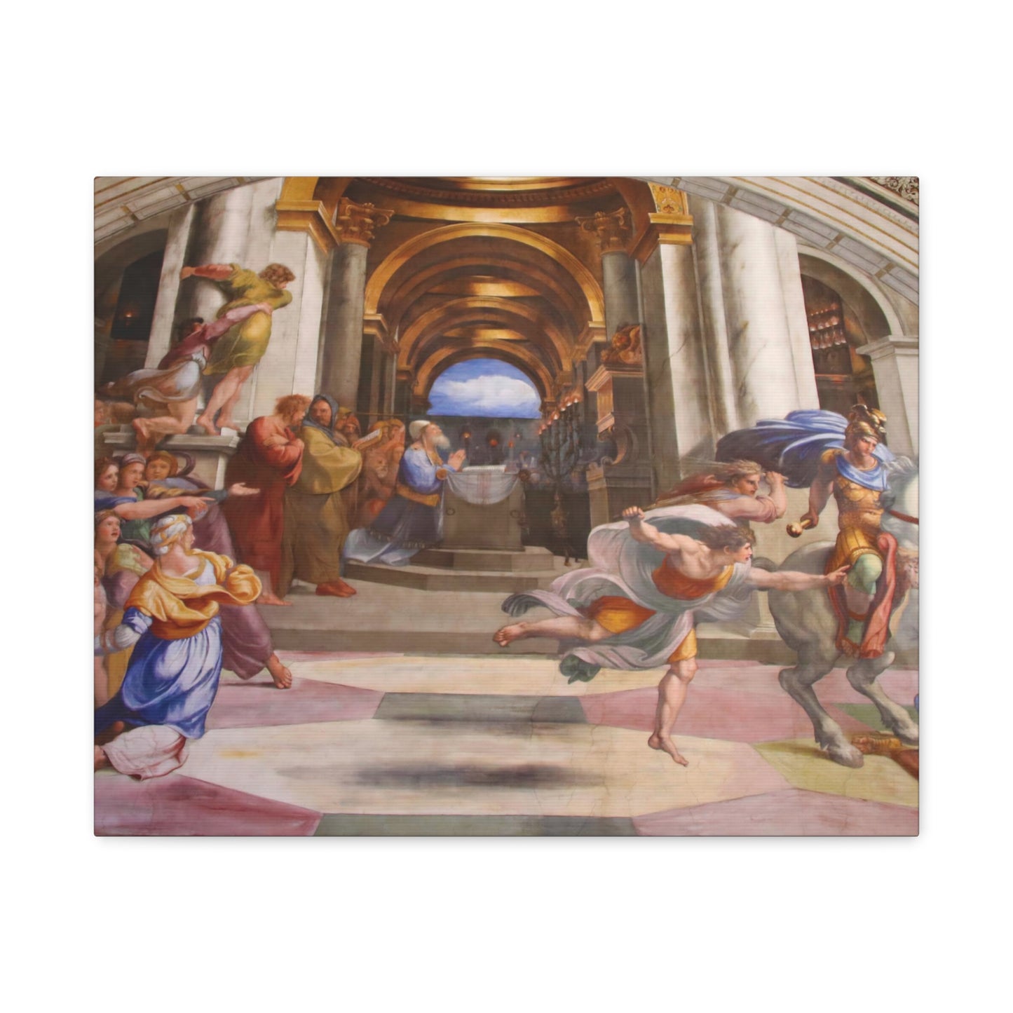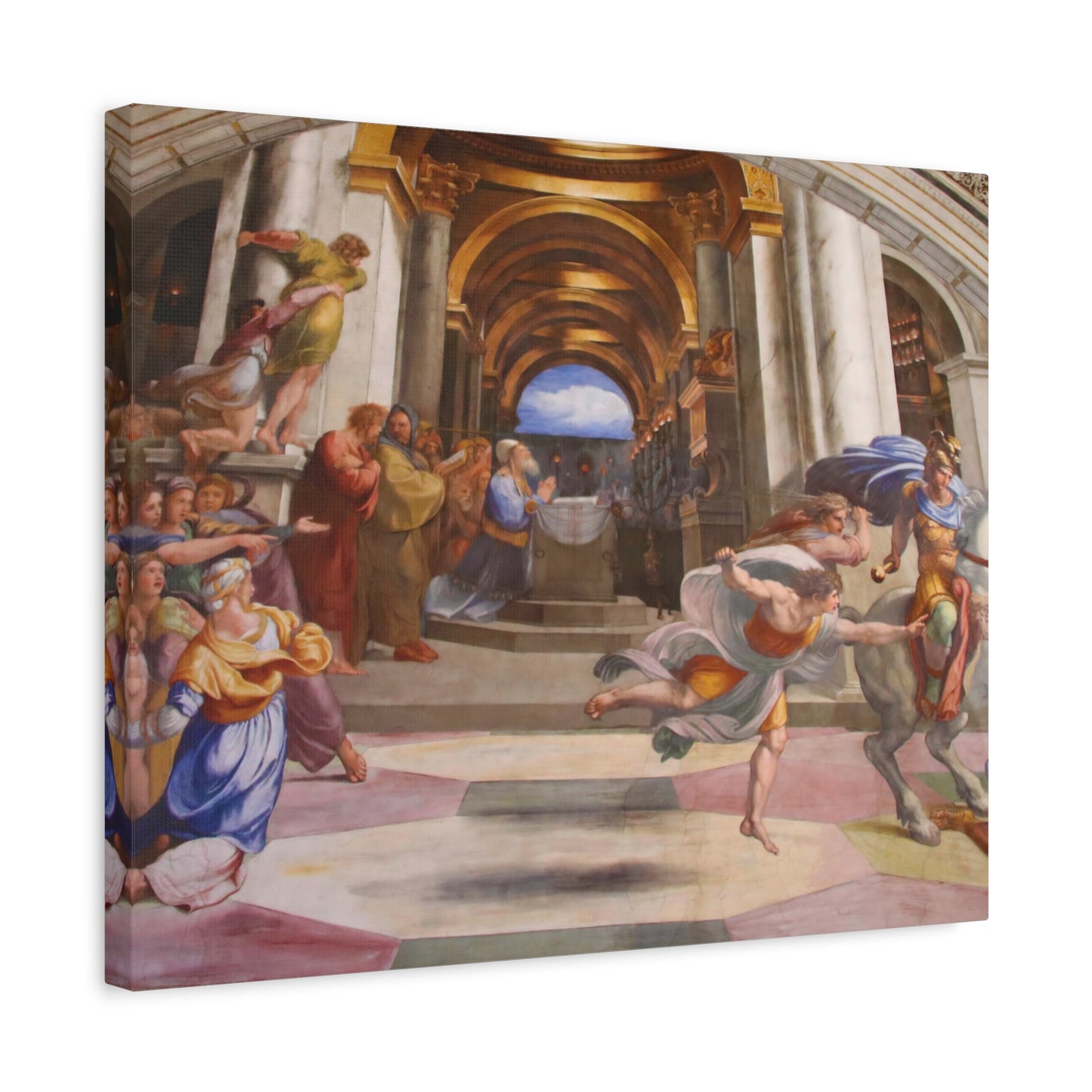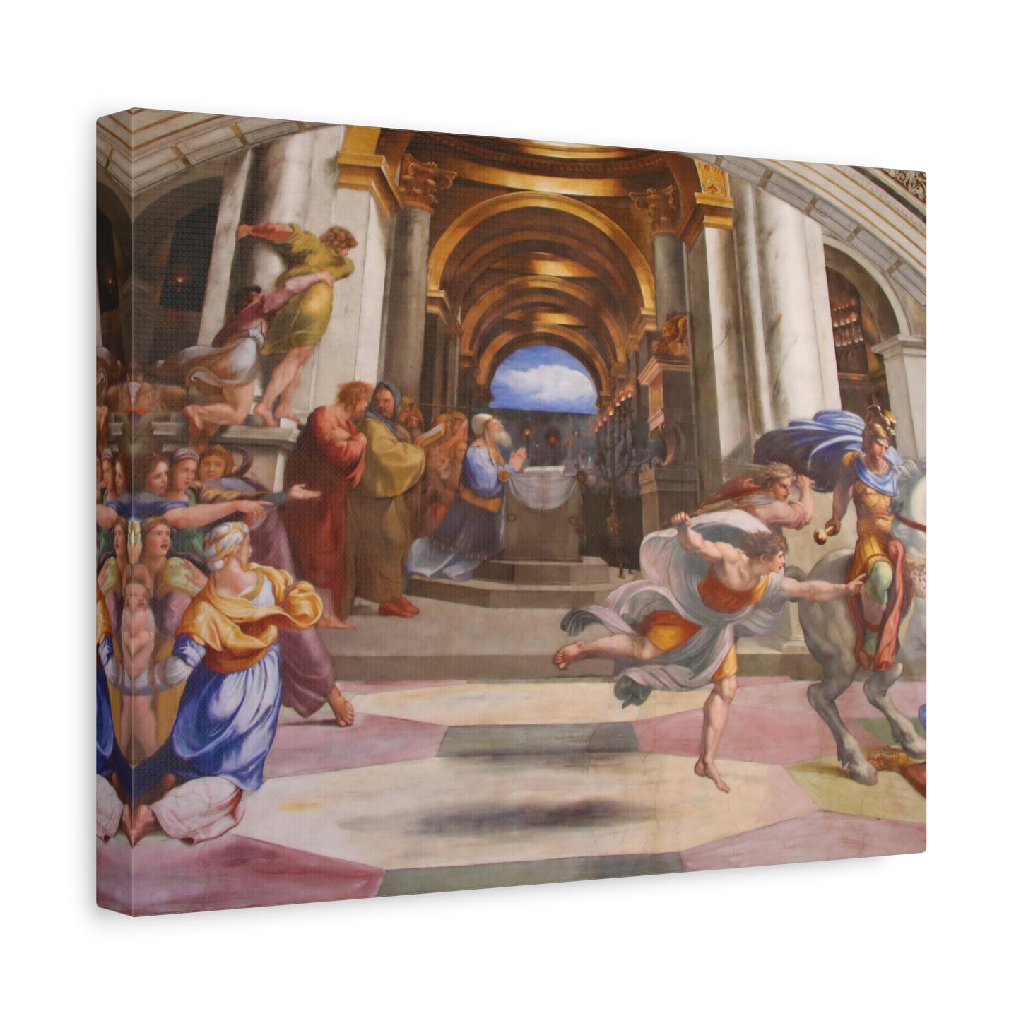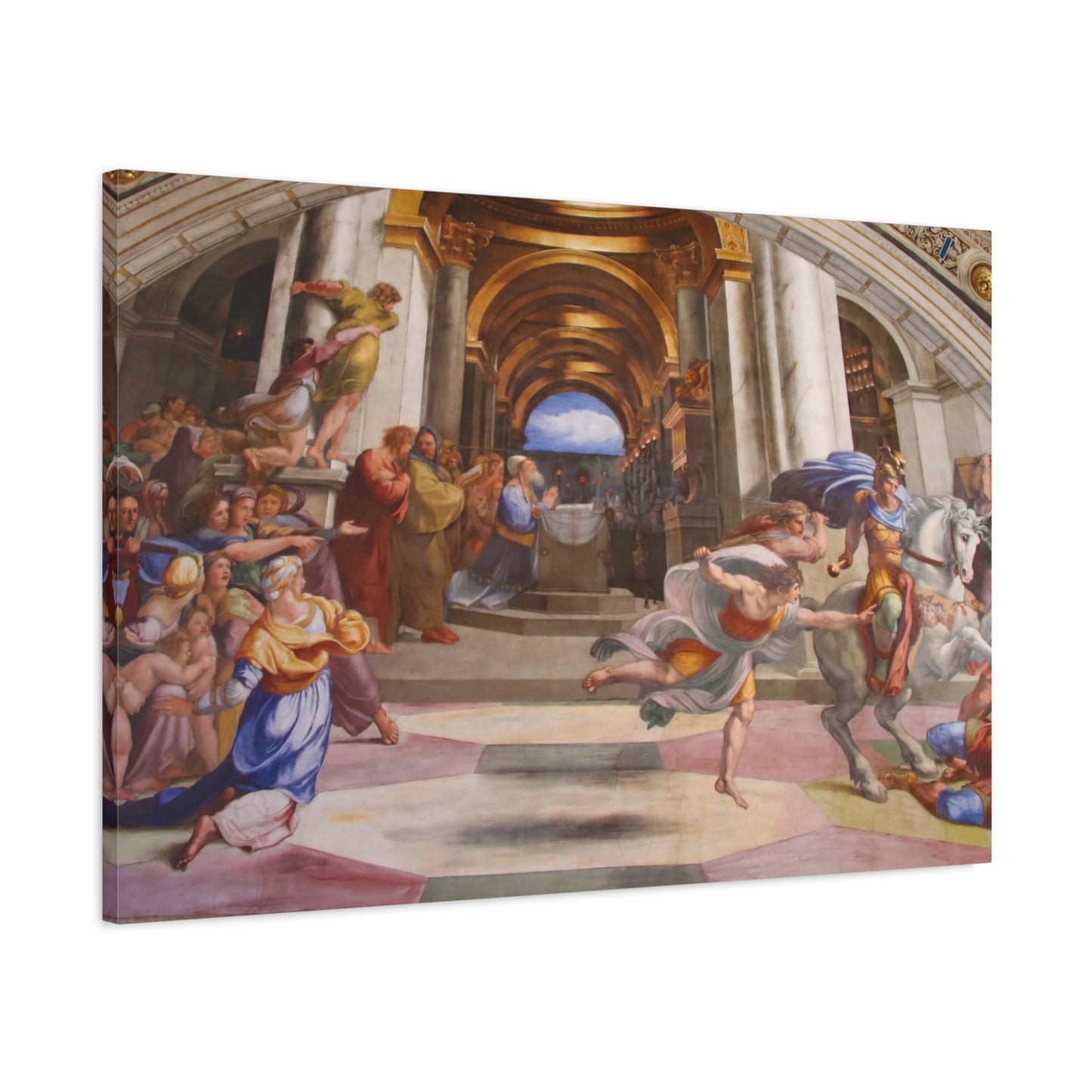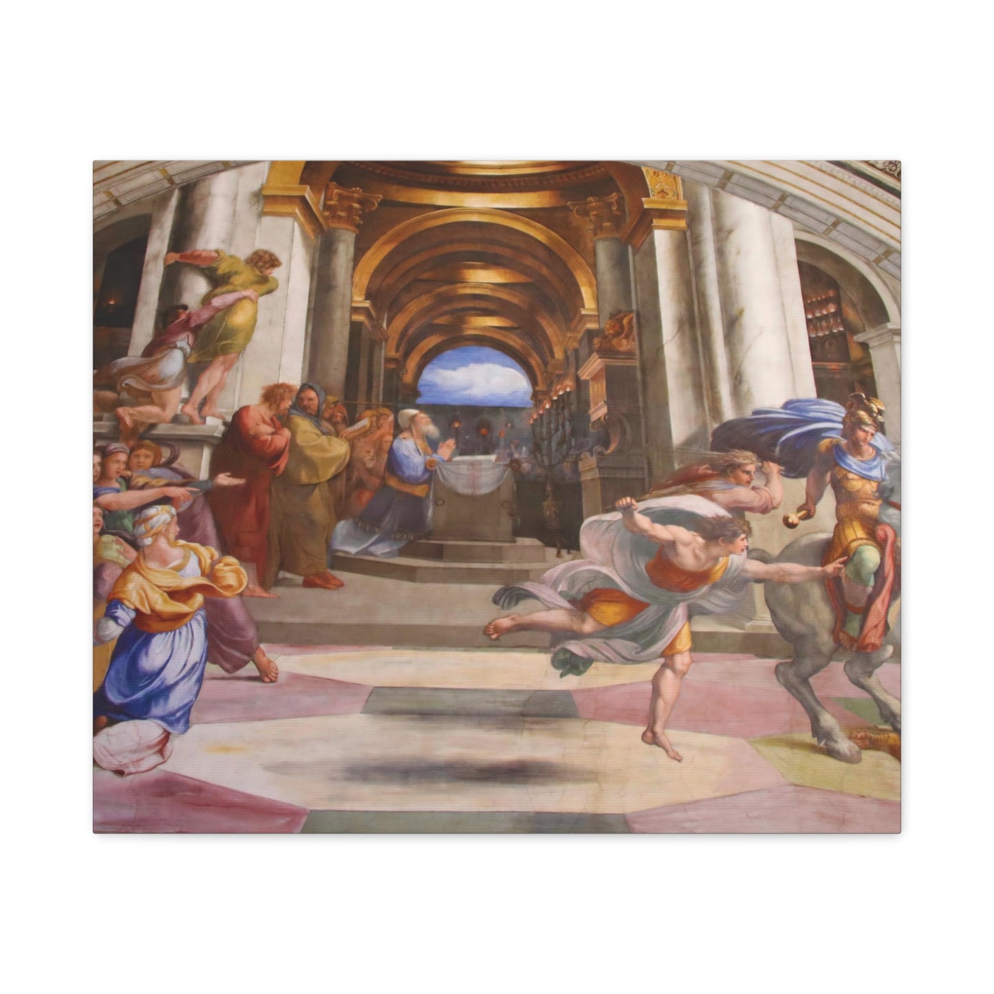 Experience the dramatic intensity of Raphael's Expulsion of Heliodorus from the Temple, created in 1512 as a captivating portrayal of divine intervention. Step into the scene as Heliodorus, a sacrilegious intruder, is forcefully expelled from the sacred space by celestial figures. This iconic masterpiece captures the clash between earthly and divine forces with its dynamic composition, skillful brushwork, and powerful emotions. Owning a replicated version of this artwork allows you to bring the grandeur and spiritual significance of the Renaissance into your home. Let the Expulsion of Heliodorus from the Temple command attention and ignite conversations, serving as a reminder of the triumph of righteousness. Immerse yourself in the epic narrative of this extraordinary painting, adding a touch of awe-inspiring beauty to your living space. Created in 1512, this timeless masterpiece continues to inspire and captivate audiences with its profound symbolism and artistic brilliance.