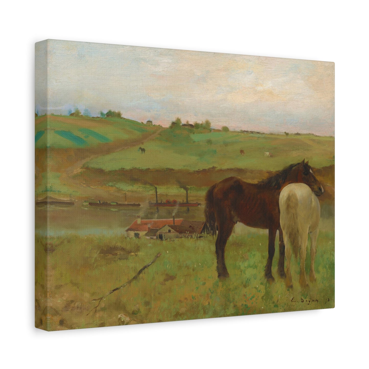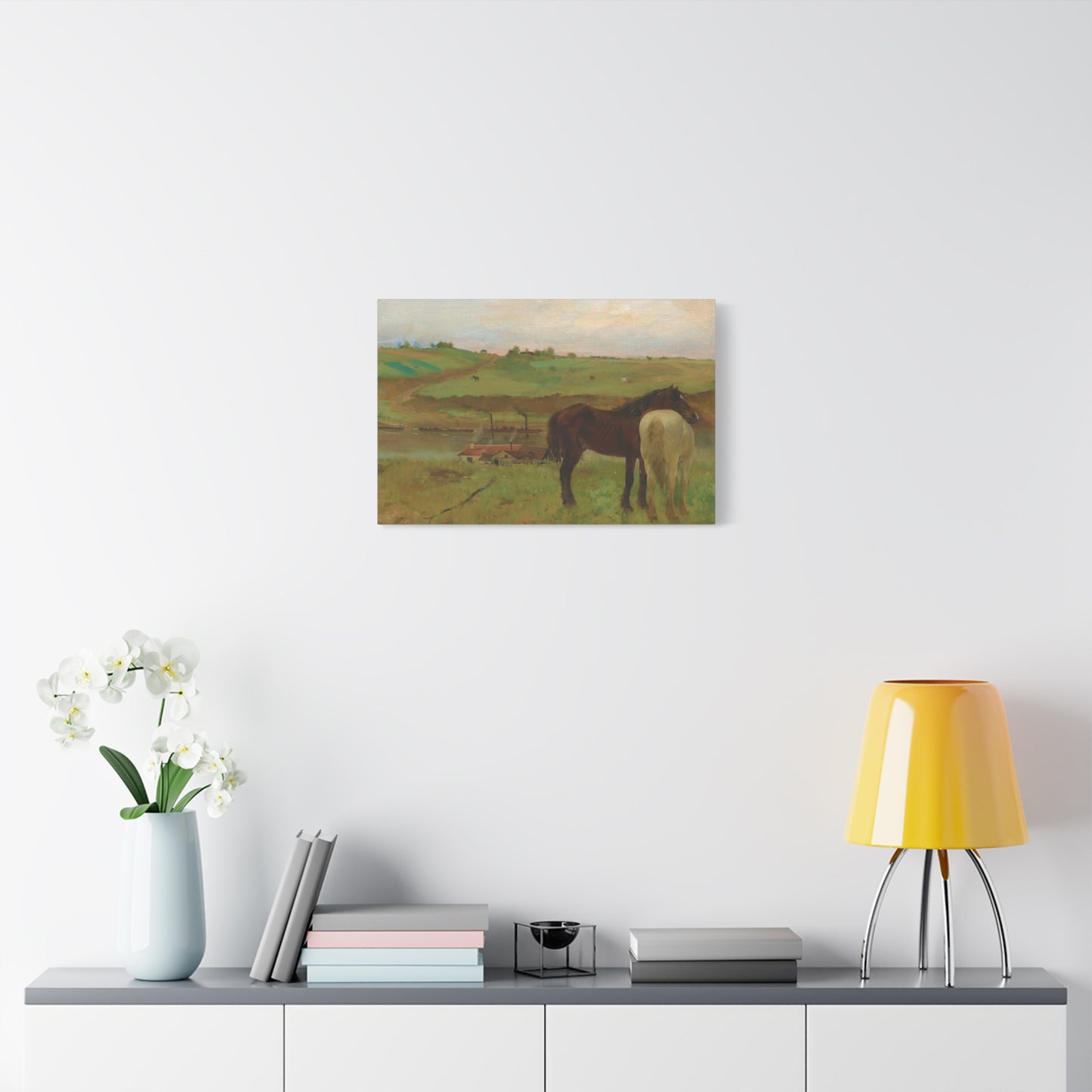 Transport yourself to a serene meadow where the beauty of nature converges with the grace of horses in Horses in a Meadow by Edgar Degas, created in 1871. Immerse yourself in this breathtaking artwork that captures the vibrant essence of these majestic creatures amidst a picturesque landscape. With each brushstroke, Degas brings the scene to life, inviting you to witness the harmonious dance between horse and nature. Owning this captivating canvas replication will infuse your home with a sense of tranquility and elegance, while also becoming a conversation starter. Indulge in the timeless allure of Degas' masterpiece and let the spirit of the horses gallop through your living space!