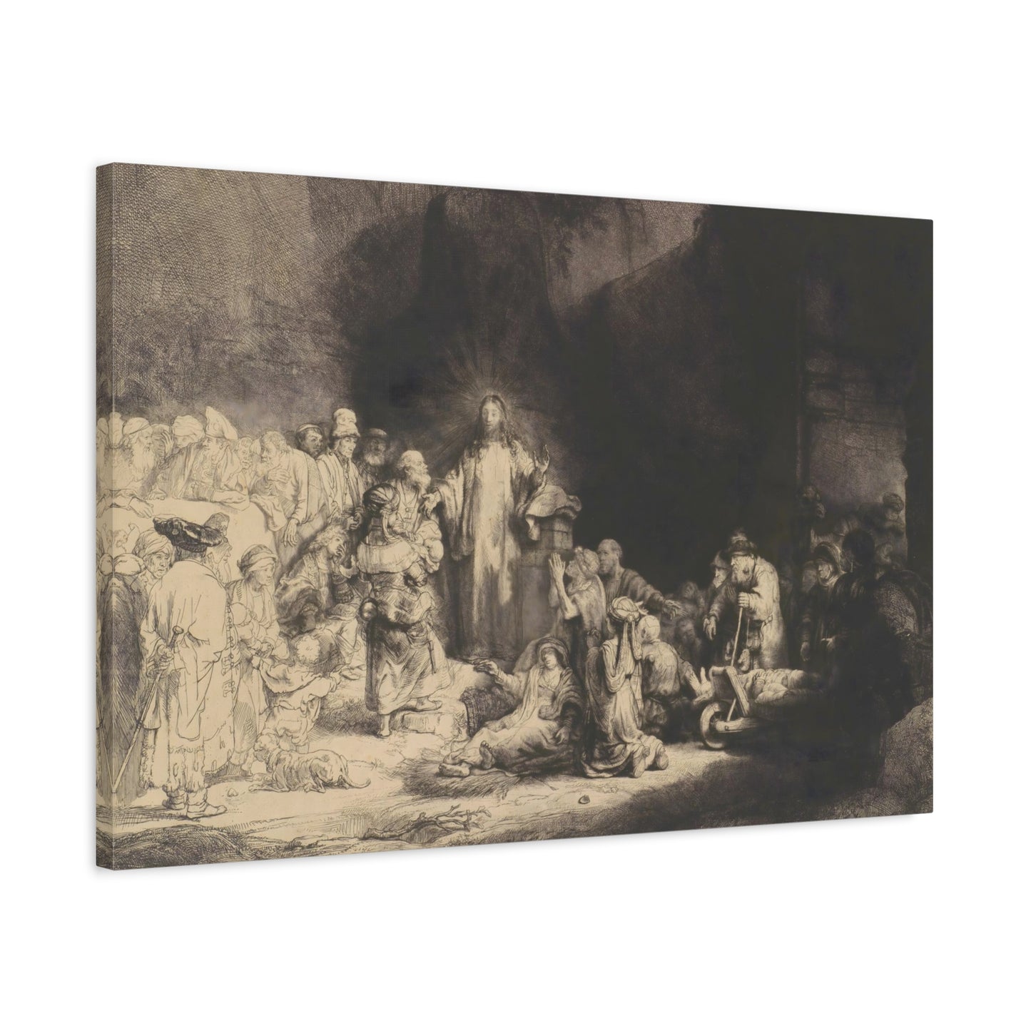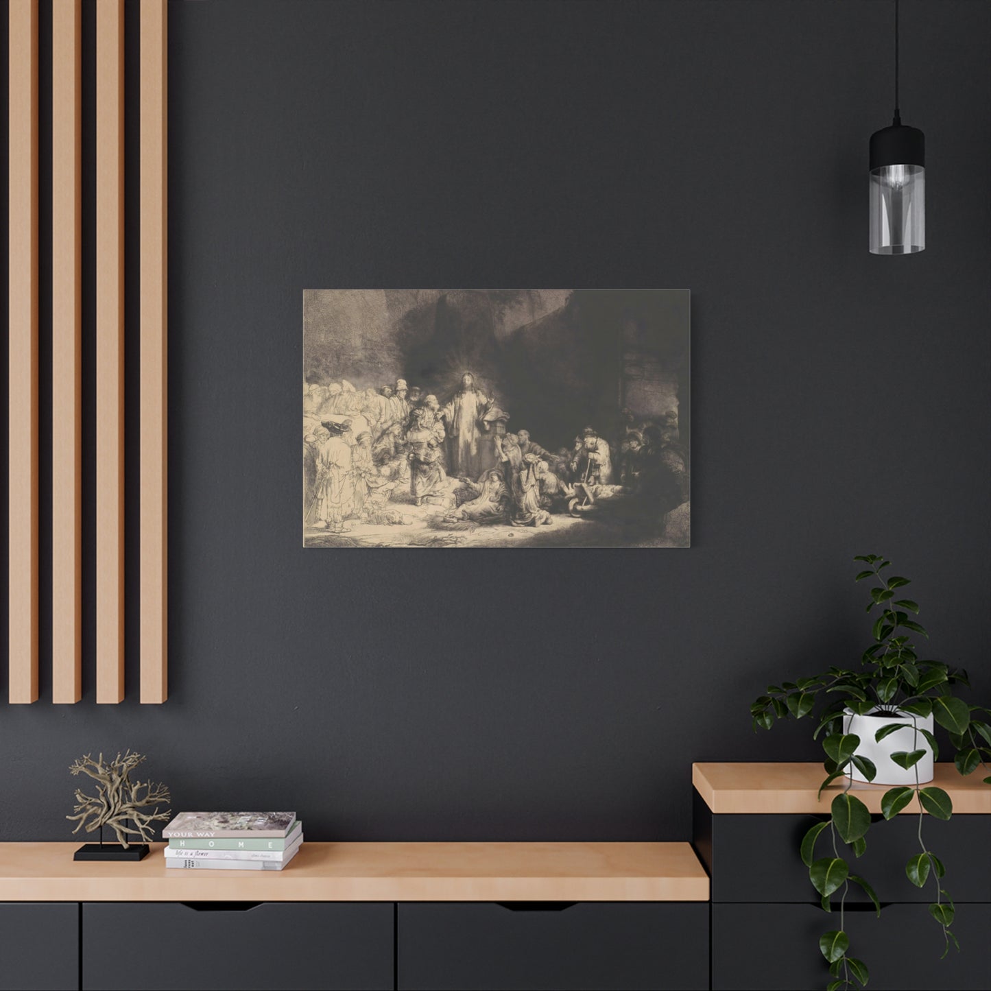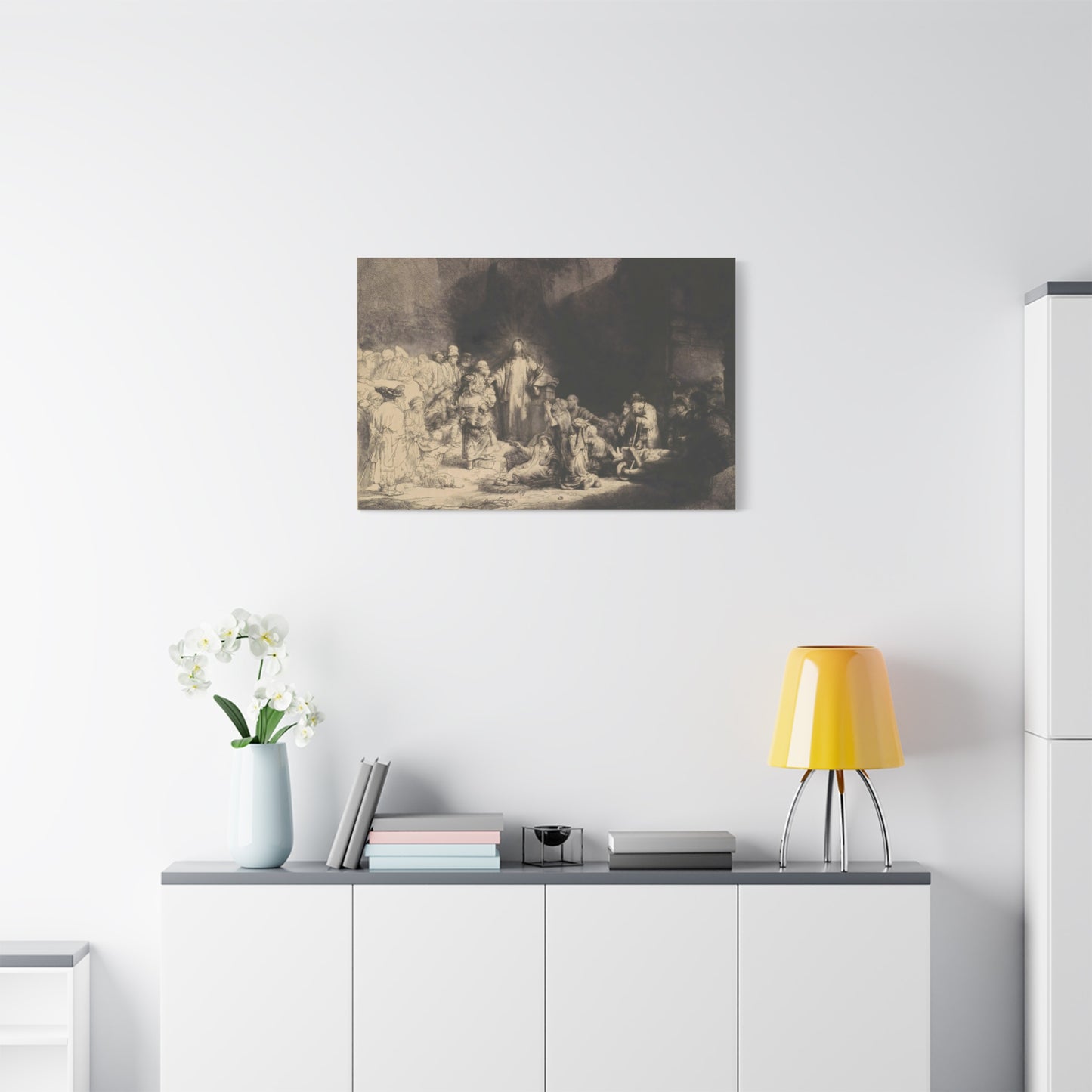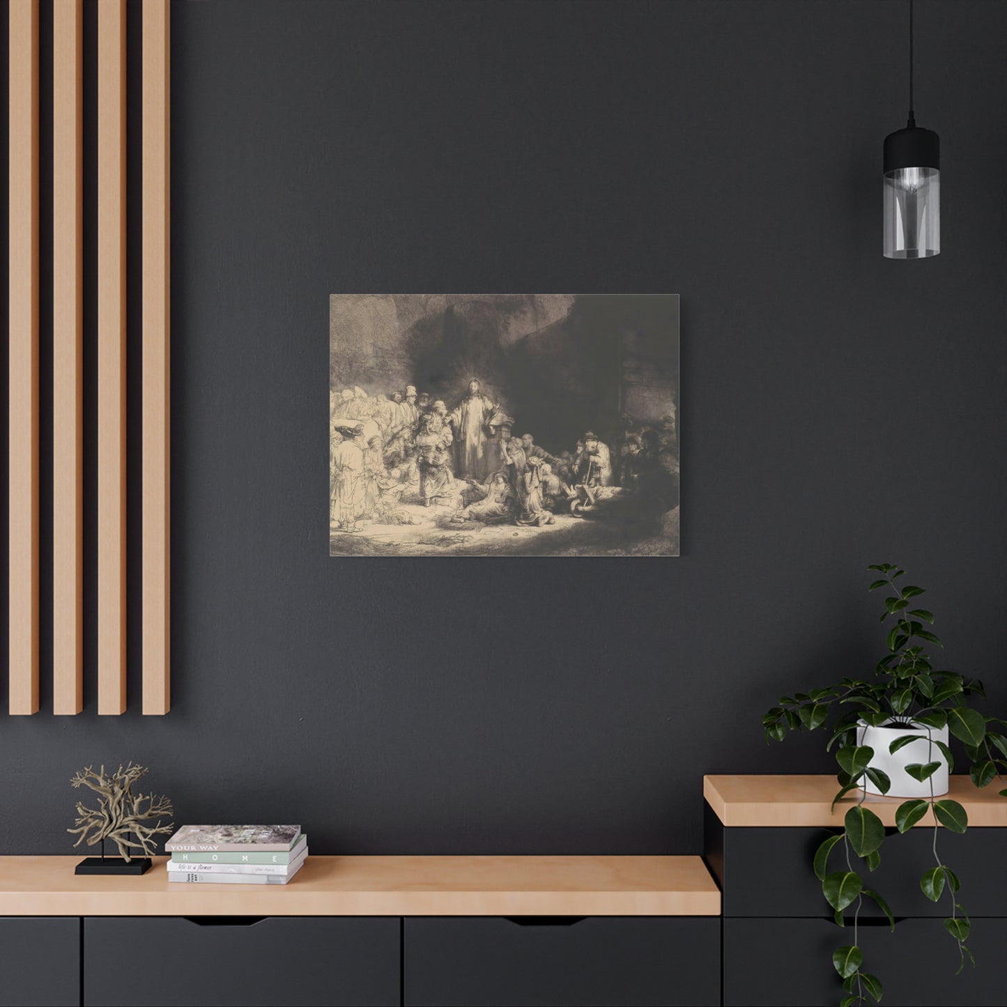 Introducing the magnificent Hundred Guilder Print by Rembrandt, a true masterpiece that showcases the artist's exceptional talent and unrivaled craftsmanship. Created in 1643, this etching is a tour de force of intricate detail, captivating storytelling, and exquisite composition. It depicts the biblical scene of Christ healing the sick and performing miracles, offering a profound glimpse into Rembrandt's profound understanding of light, shadow, and human emotions. By owning a canvas art replication of the Hundred Guilder Print, you bring home a piece of art history and immerse yourself in Rembrandt's genius. The rich symbolism, impeccable technique, and timeless beauty of this artwork make it a captivating addition to any art collection. Experience the power and grace of Rembrandt's masterwork in your own space and let it inspire and uplift you every day. Don't miss the opportunity to own a piece of art that will leave a lasting impression on all who behold it.