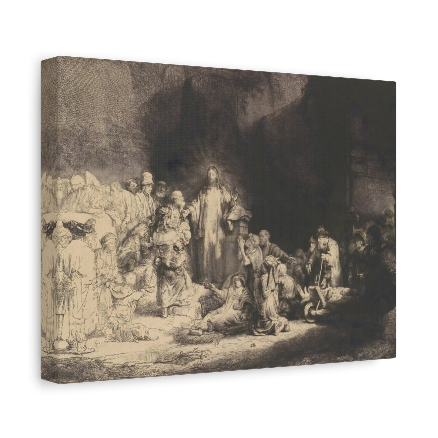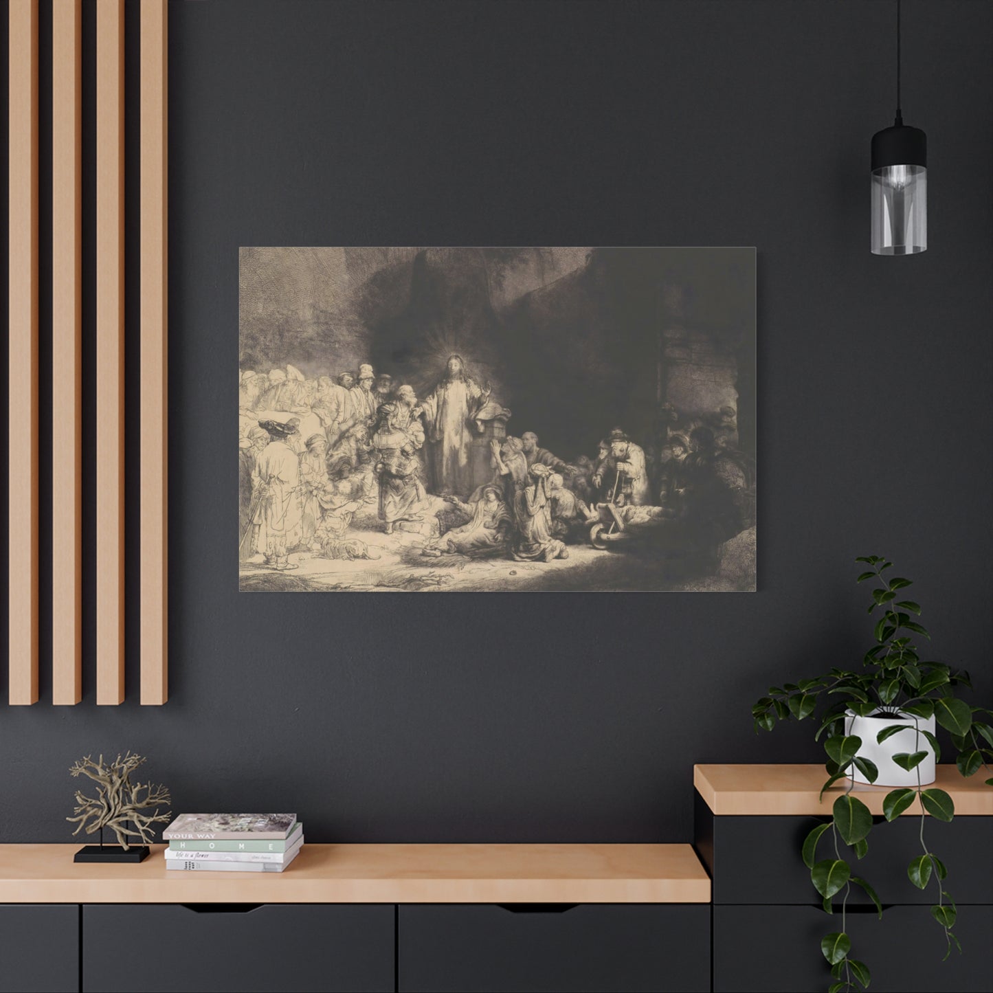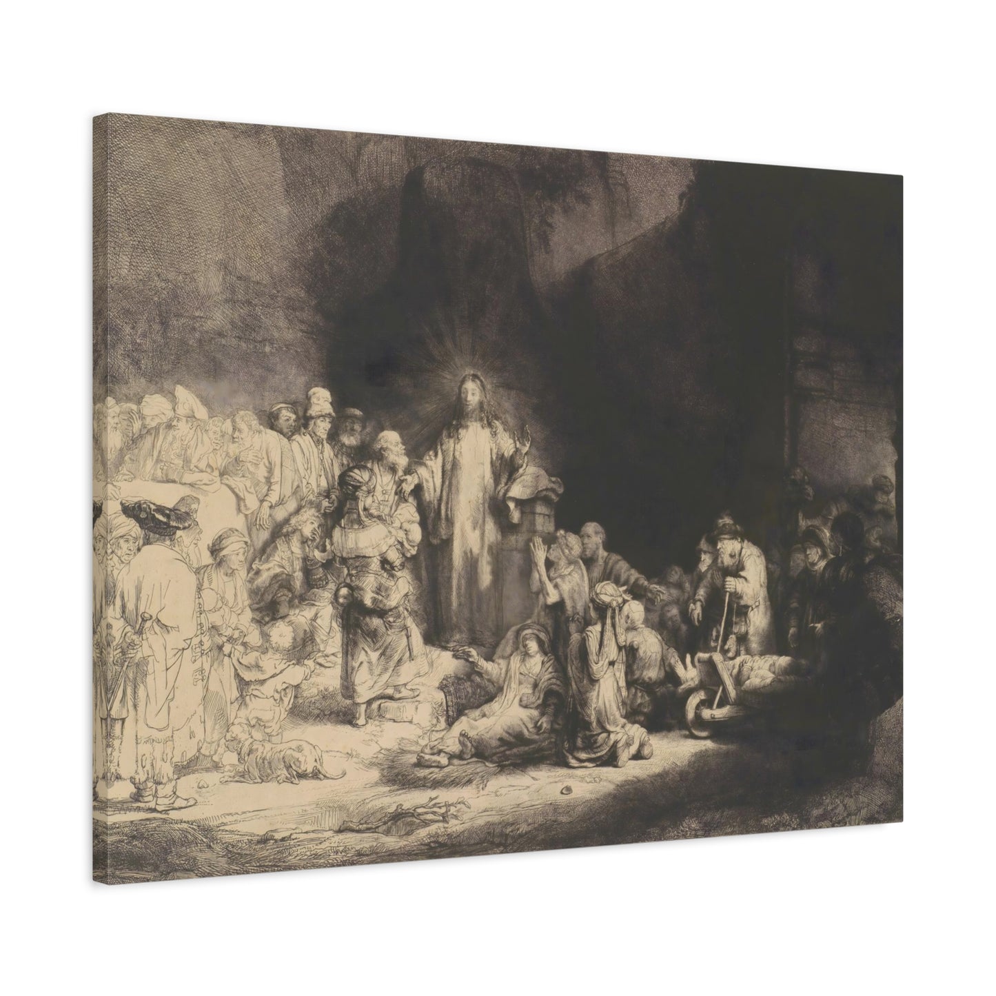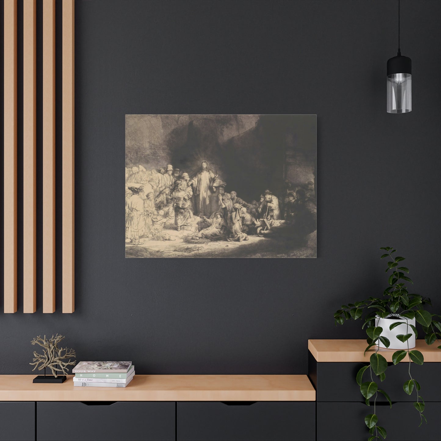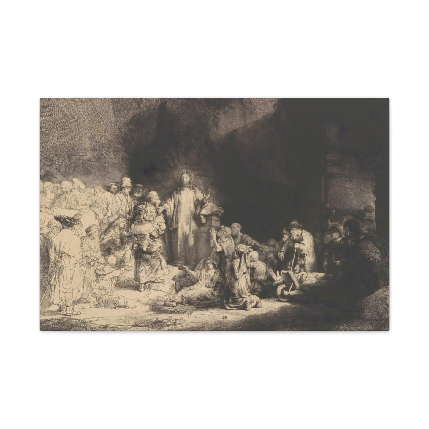 Introducing the magnificent Hundred Guilder Print by Rembrandt, a true masterpiece that showcases the artist's exceptional talent and unrivaled craftsmanship. Created in 1643, this etching is a tour de force of intricate detail, captivating storytelling, and exquisite composition. It depicts the biblical scene of Christ healing the sick and performing miracles, offering a profound glimpse into Rembrandt's profound understanding of light, shadow, and human emotions. By owning a canvas art replication of the Hundred Guilder Print, you bring home a piece of art history and immerse yourself in Rembrandt's genius. The rich symbolism, impeccable technique, and timeless beauty of this artwork make it a captivating addition to any art collection. Experience the power and grace of Rembrandt's masterwork in your own space and let it inspire and uplift you every day. Don't miss the opportunity to own a piece of art that will leave a lasting impression on all who behold it.