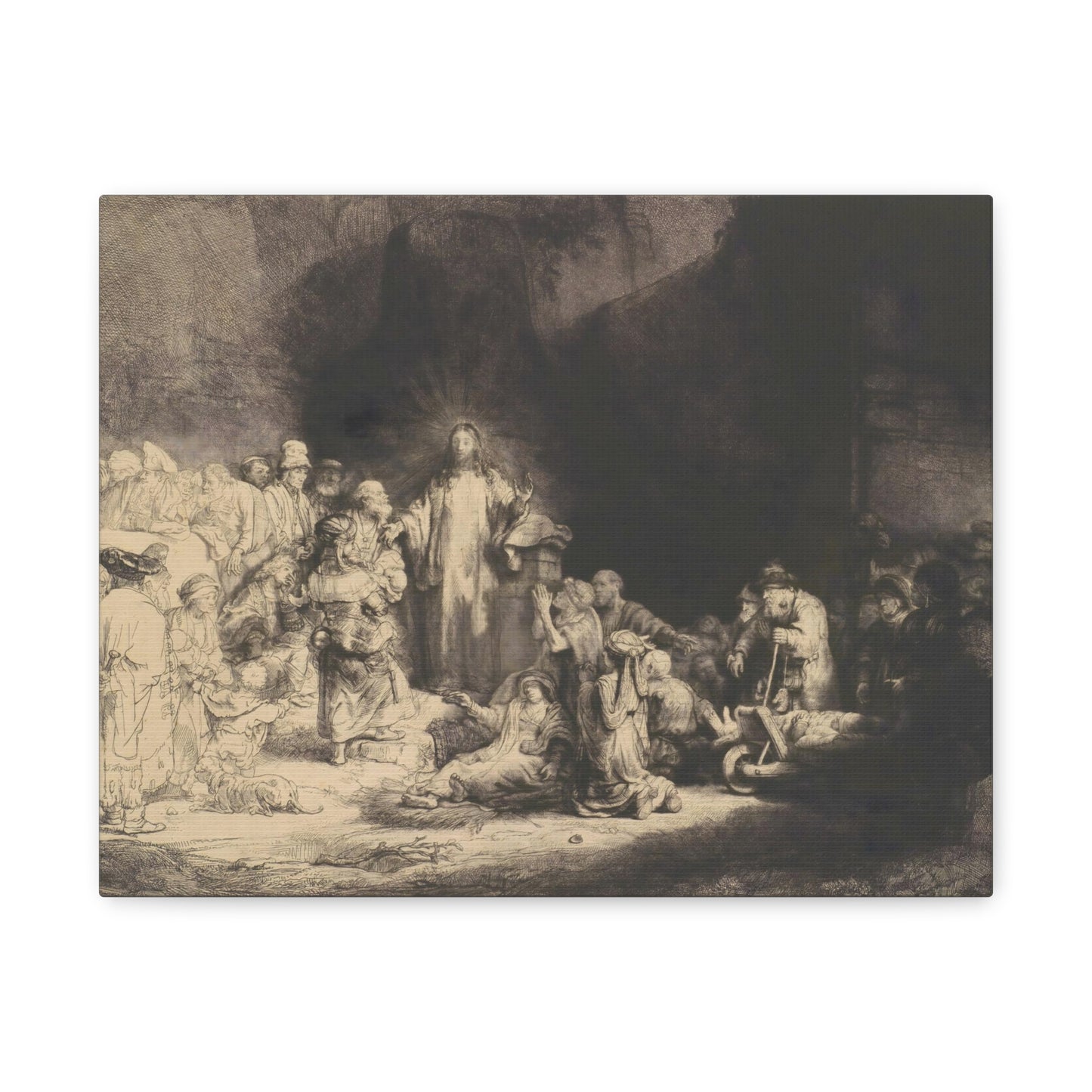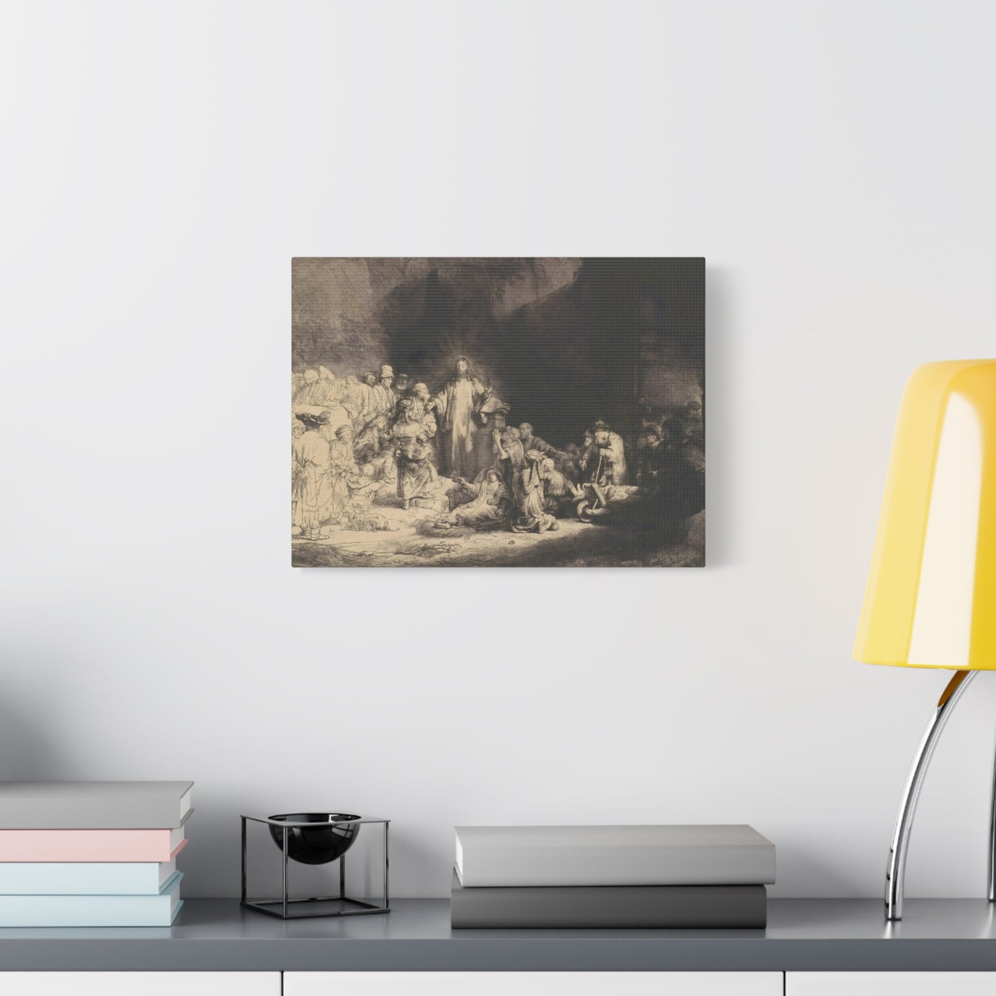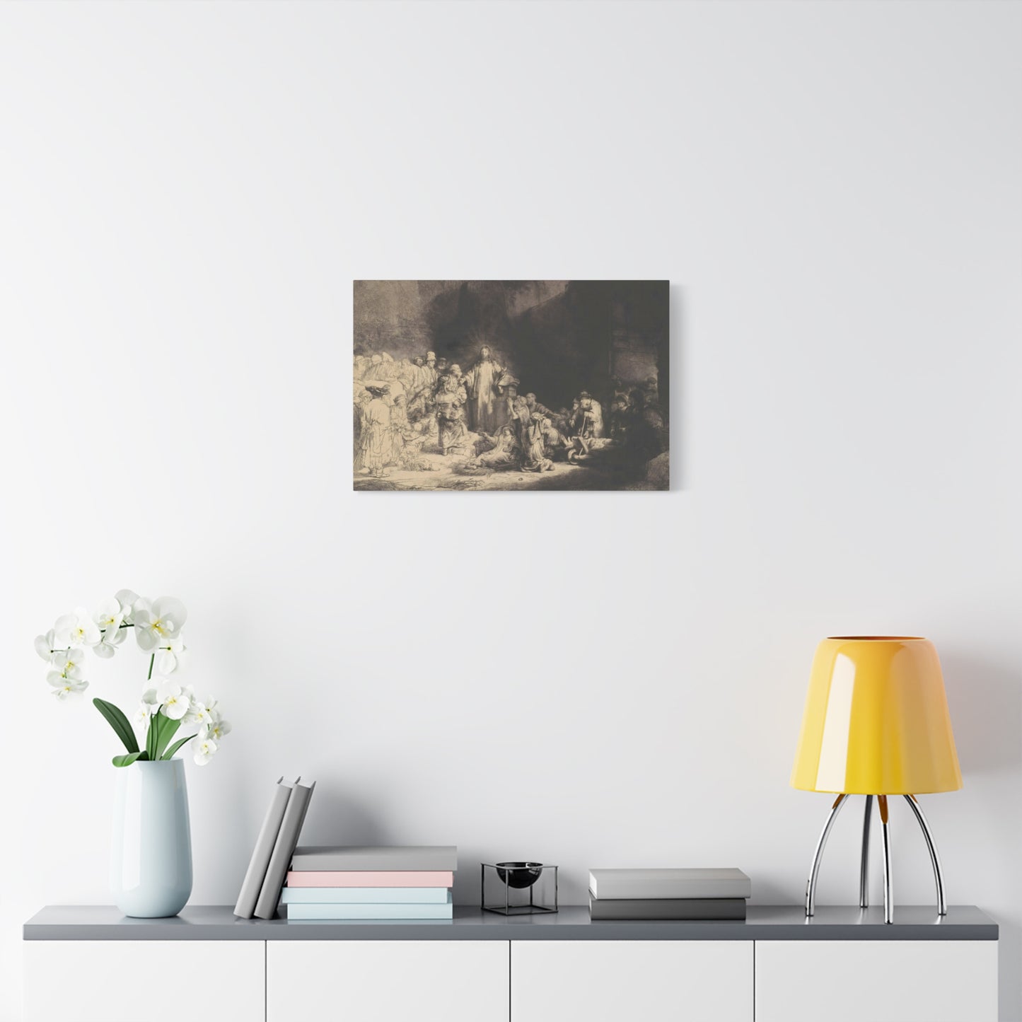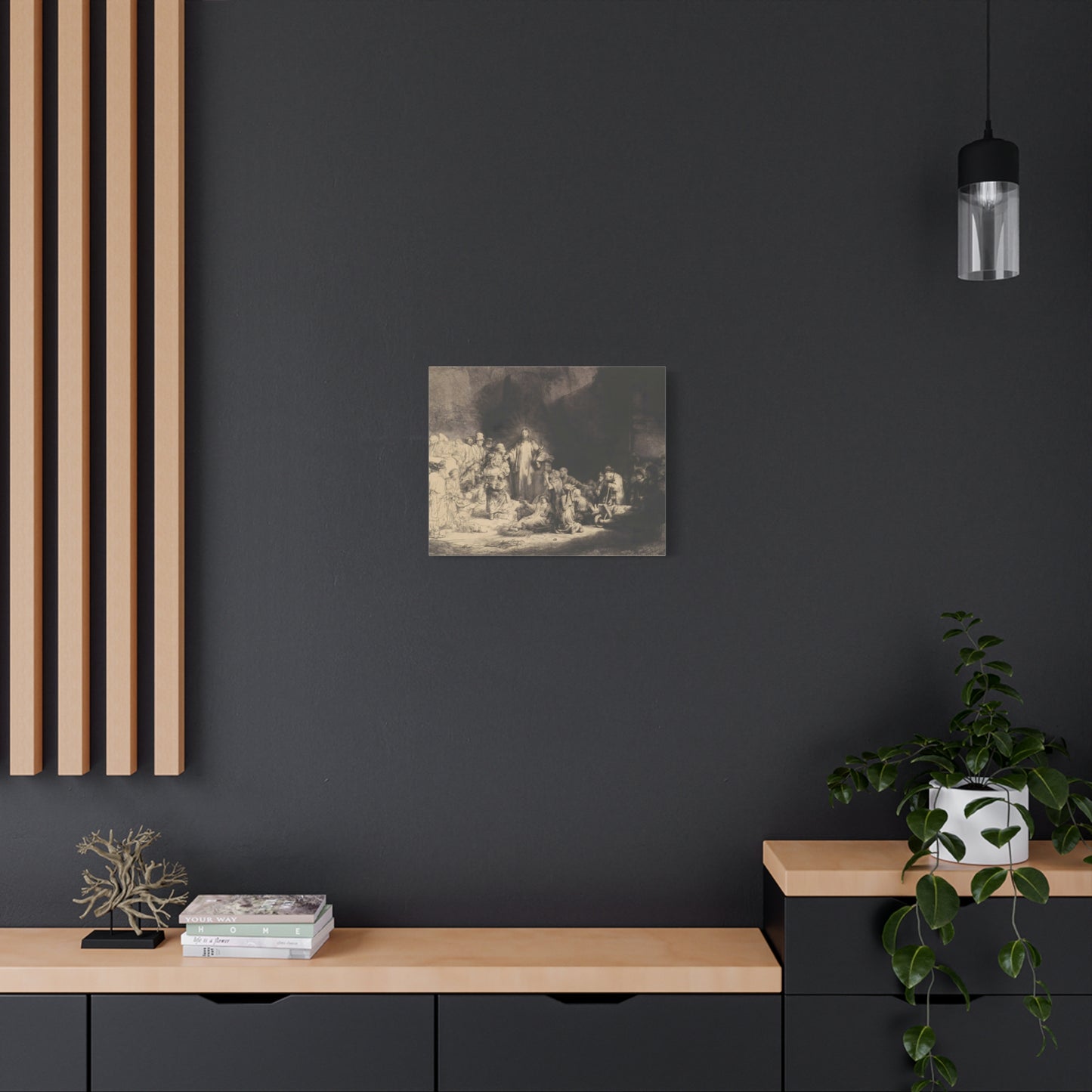 Introducing the magnificent Hundred Guilder Print by Rembrandt, a true masterpiece that showcases the artist's exceptional talent and unrivaled craftsmanship. Created in 1643, this etching is a tour de force of intricate detail, captivating storytelling, and exquisite composition. It depicts the biblical scene of Christ healing the sick and performing miracles, offering a profound glimpse into Rembrandt's profound understanding of light, shadow, and human emotions. By owning a canvas art replication of the Hundred Guilder Print, you bring home a piece of art history and immerse yourself in Rembrandt's genius. The rich symbolism, impeccable technique, and timeless beauty of this artwork make it a captivating addition to any art collection. Experience the power and grace of Rembrandt's masterwork in your own space and let it inspire and uplift you every day. Don't miss the opportunity to own a piece of art that will leave a lasting impression on all who behold it.