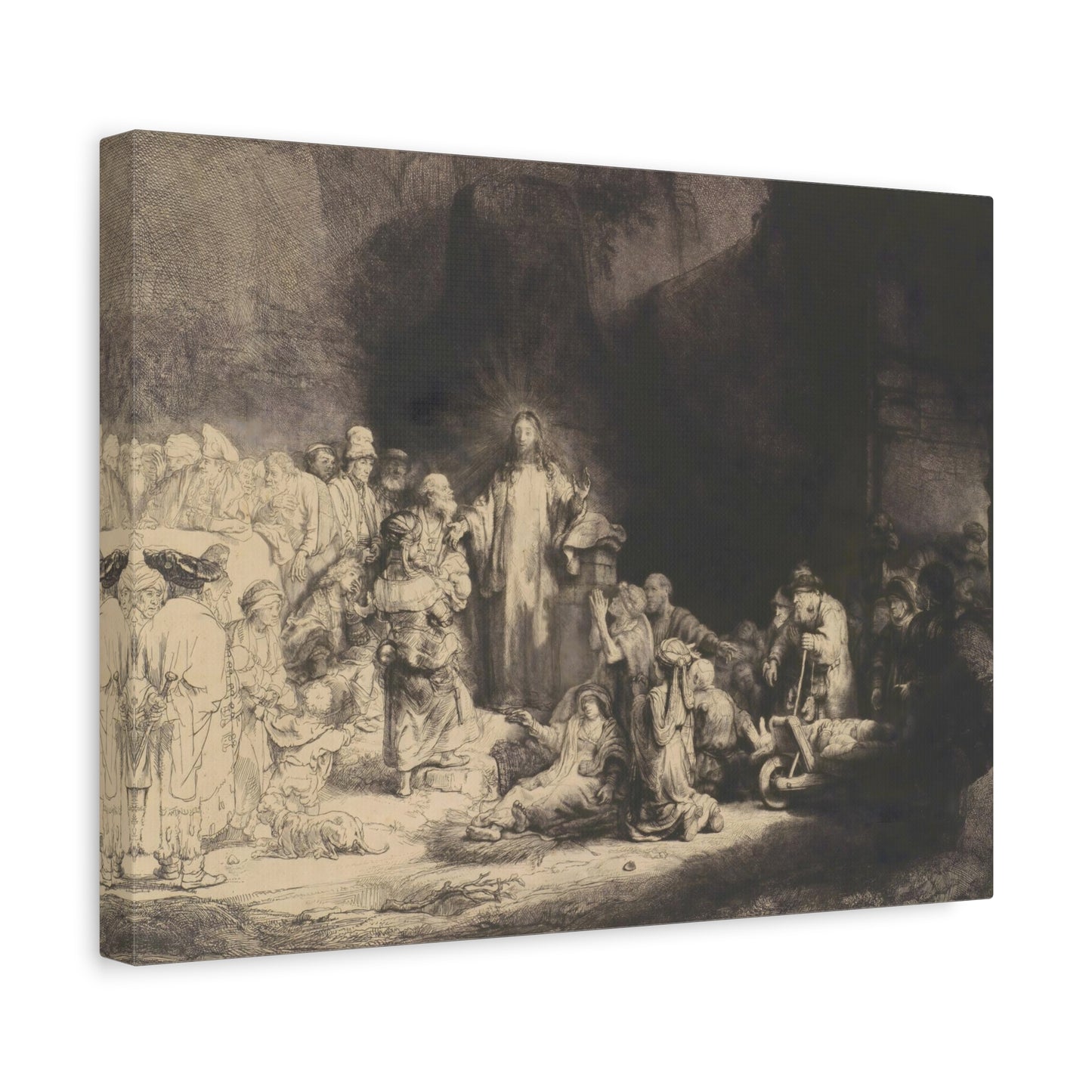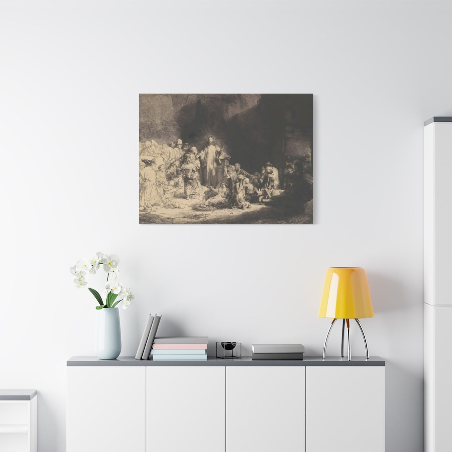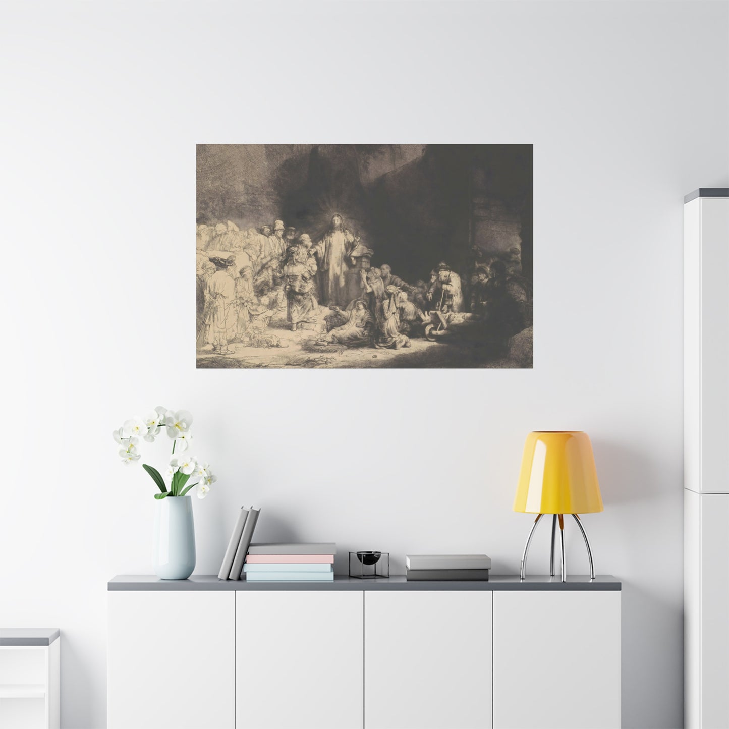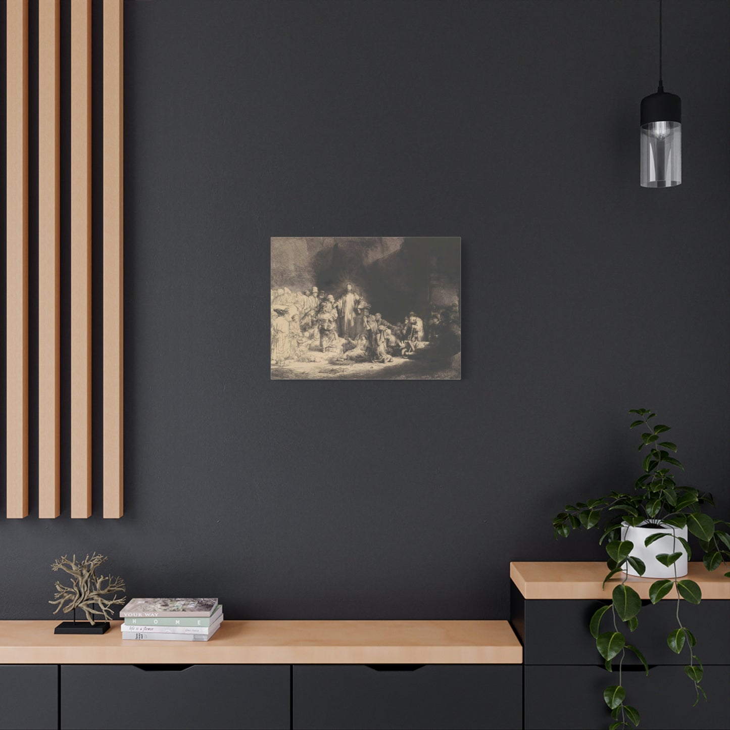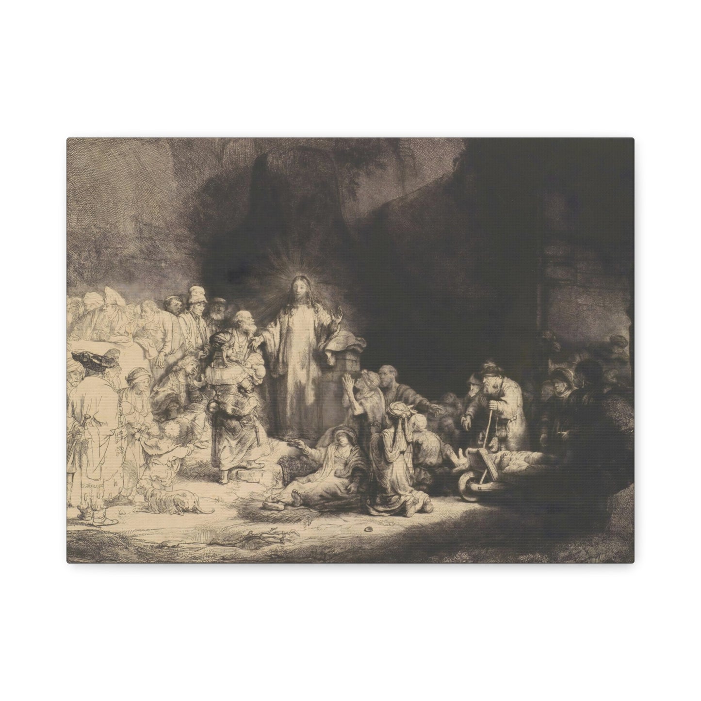 Introducing the magnificent Hundred Guilder Print by Rembrandt, a true masterpiece that showcases the artist's exceptional talent and unrivaled craftsmanship. Created in 1643, this etching is a tour de force of intricate detail, captivating storytelling, and exquisite composition. It depicts the biblical scene of Christ healing the sick and performing miracles, offering a profound glimpse into Rembrandt's profound understanding of light, shadow, and human emotions. By owning a canvas art replication of the Hundred Guilder Print, you bring home a piece of art history and immerse yourself in Rembrandt's genius. The rich symbolism, impeccable technique, and timeless beauty of this artwork make it a captivating addition to any art collection. Experience the power and grace of Rembrandt's masterwork in your own space and let it inspire and uplift you every day. Don't miss the opportunity to own a piece of art that will leave a lasting impression on all who behold it.