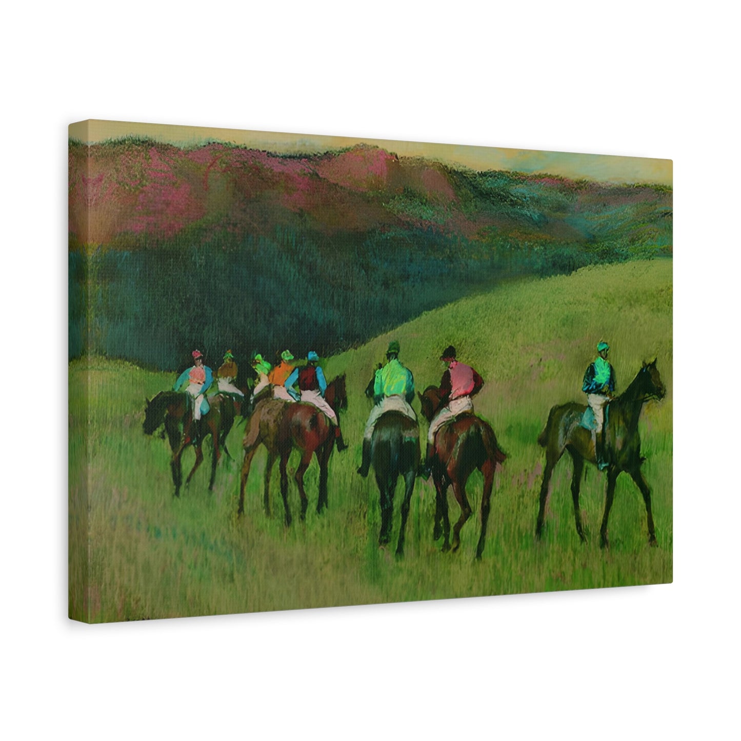 Step into a world where the thundering hooves of majestic racehorses echo through a captivating landscape! Experience the exhilaration and artistic genius of Edgar Degas with Racehorses in a Landscape. Created in 1894, this masterpiece embodies the power and grace of these magnificent creatures in vibrant brushstrokes. Hang this electrifying artwork in your home, and be transported to the heart-pounding world of horse racing. With its timeless beauty and dynamic composition, Racehorses in a Landscape will captivate your senses, adding an infusion of excitement and elegance to any room. Indulge in the thrill of Degas every day!