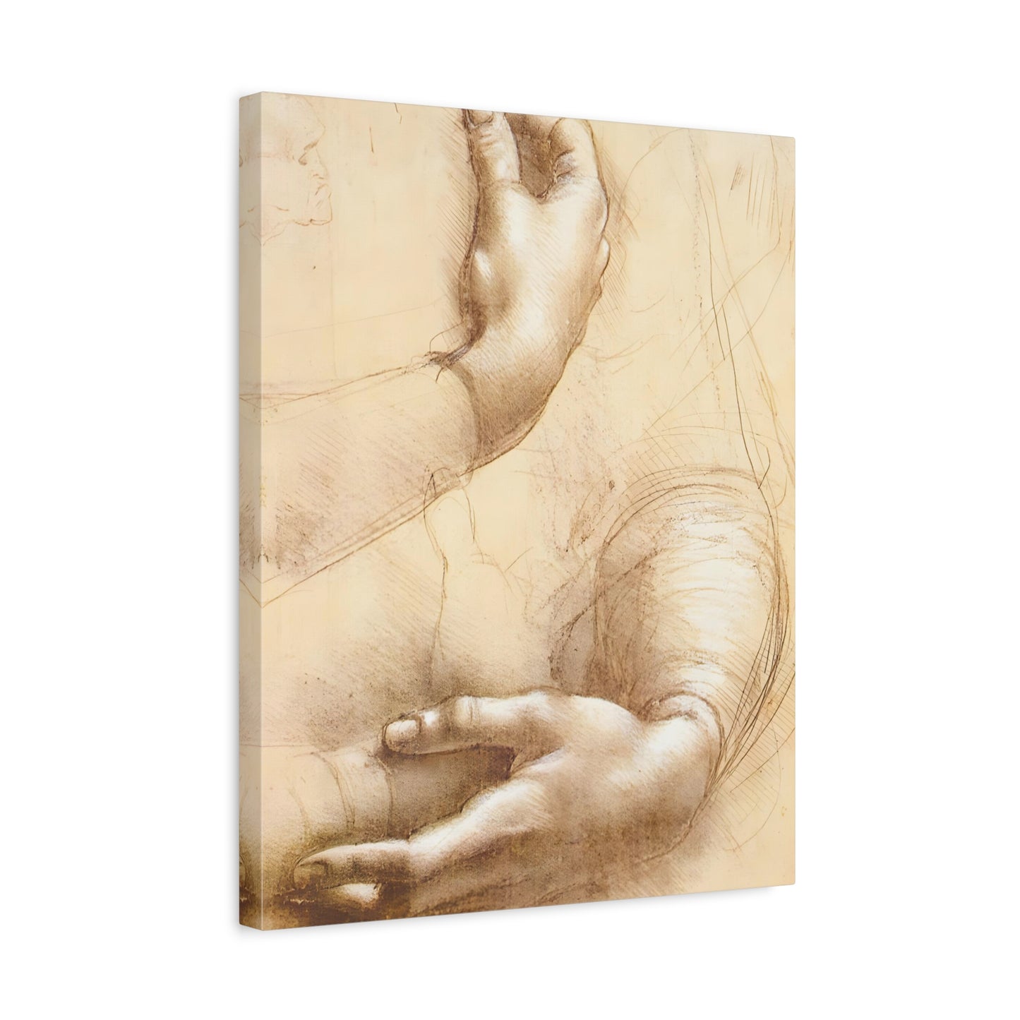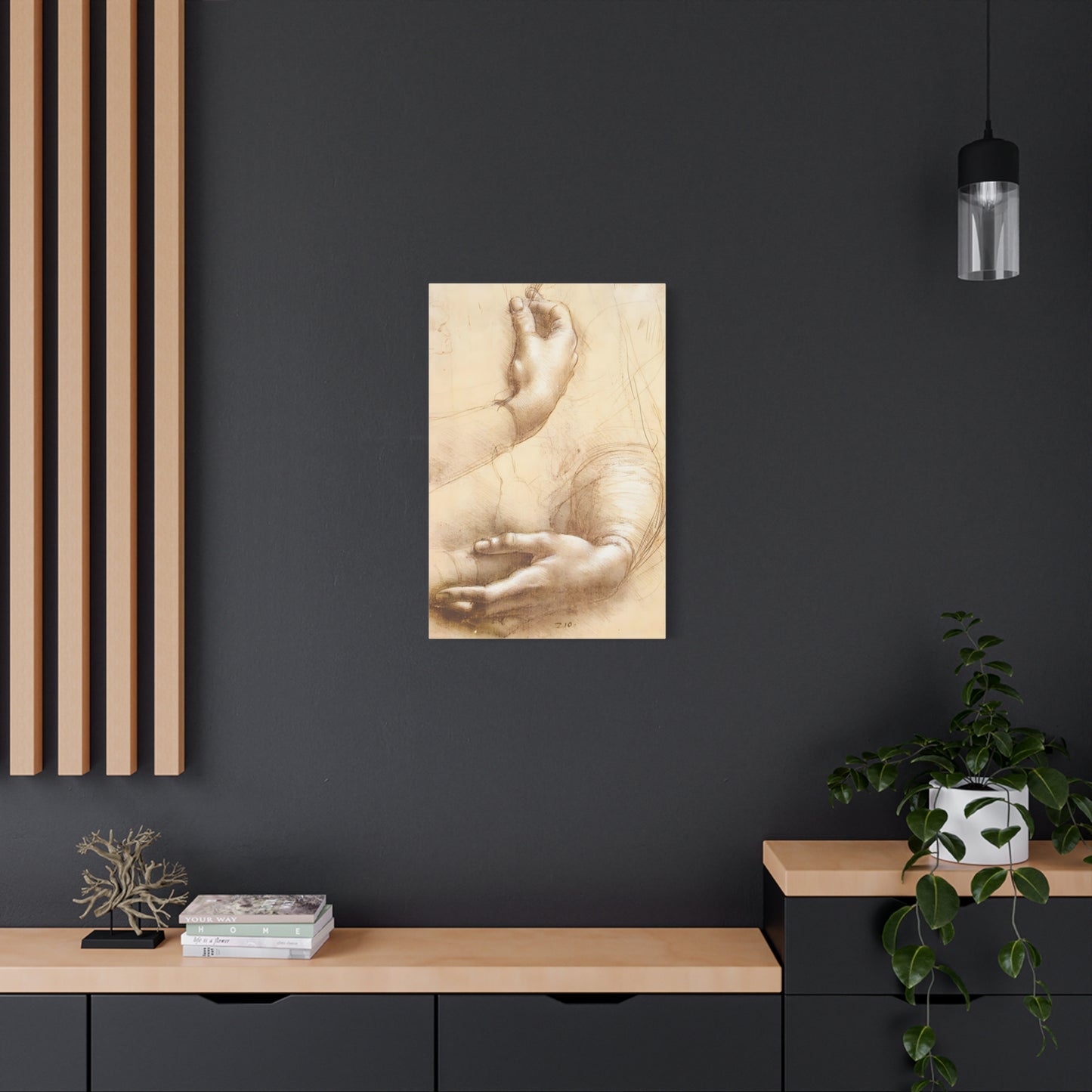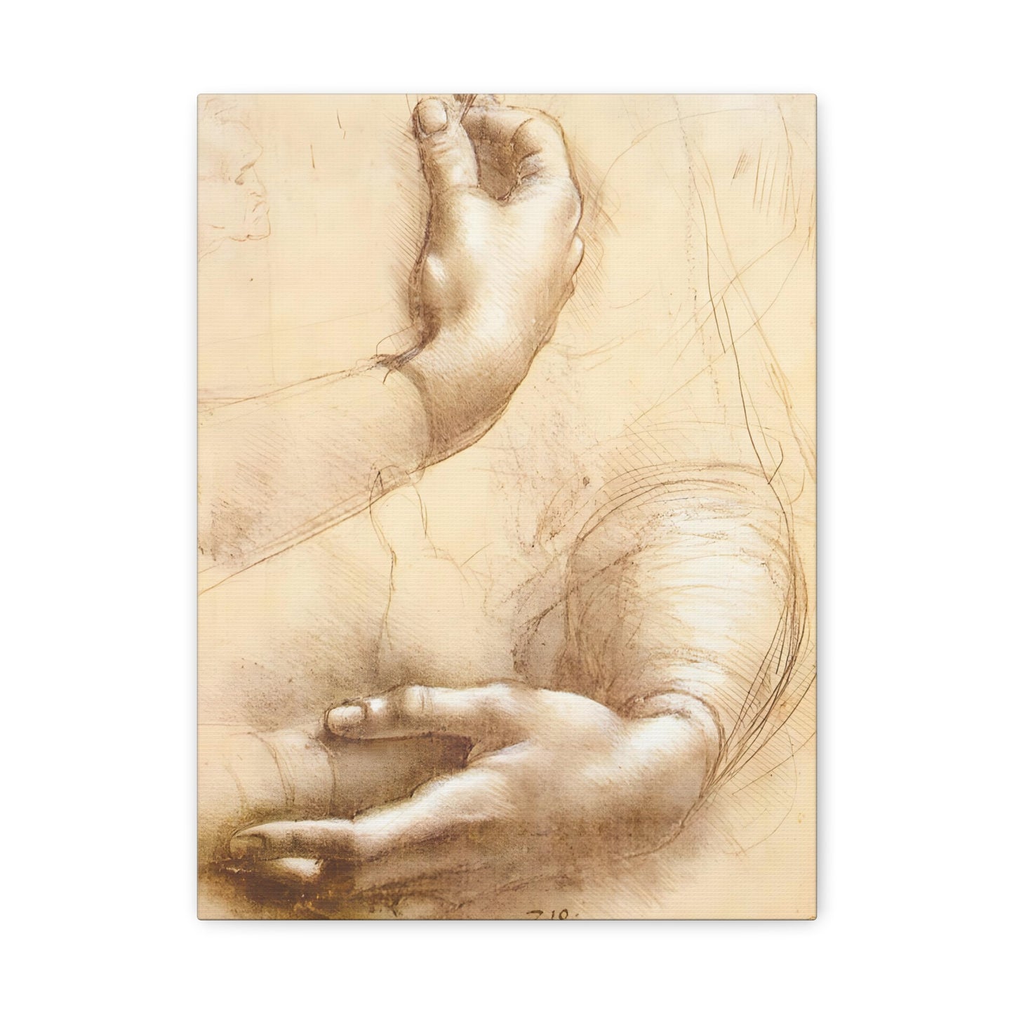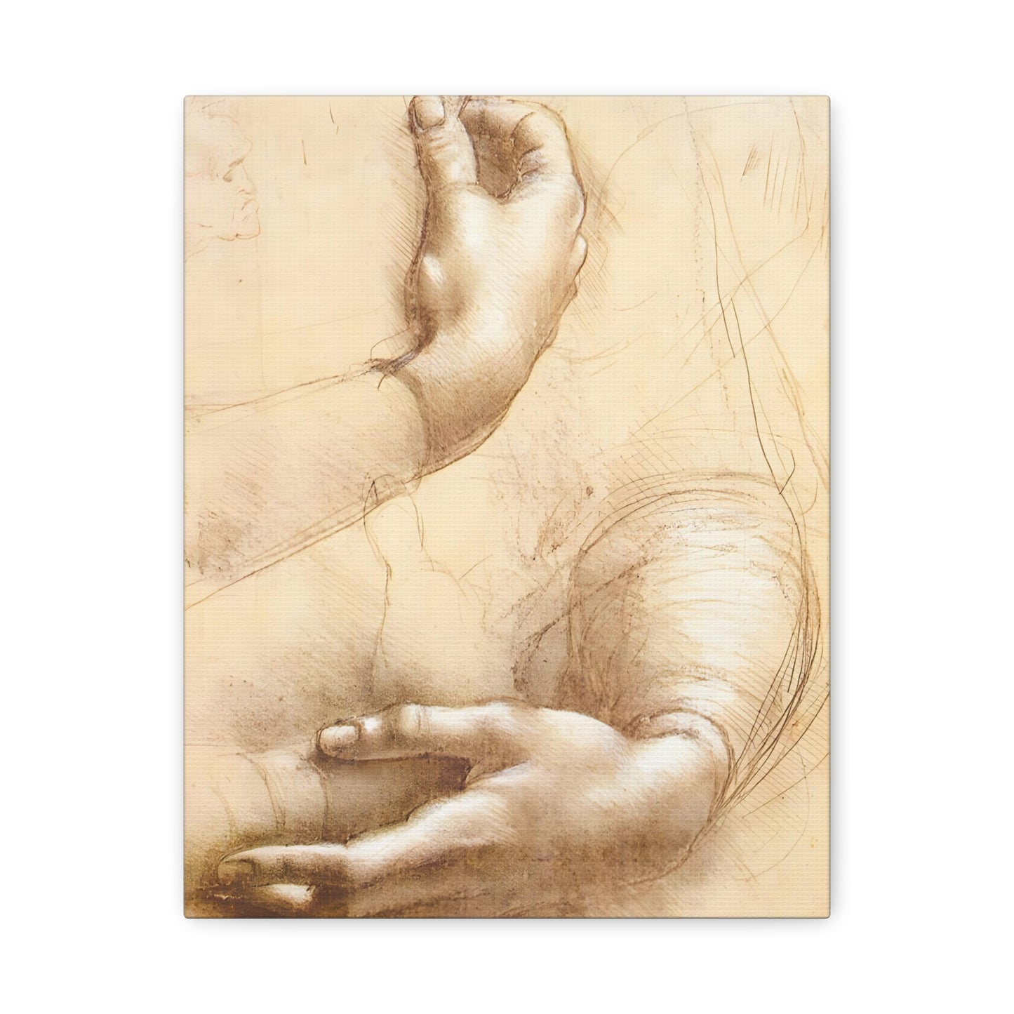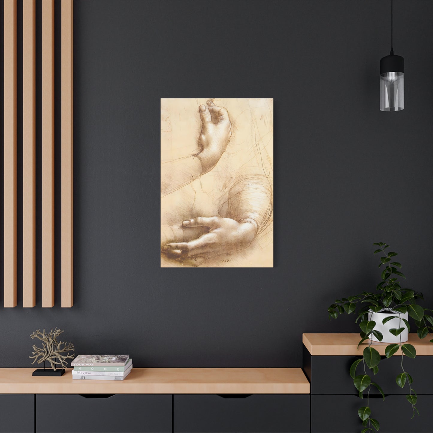 Immerse yourself in the exquisite mastery of Leonardo da Vinci's Study of Hands, created in the late 15th century. This captivating artwork showcases da Vinci's unparalleled ability to capture the intricate beauty and expressiveness of human hands. The level of detail and precision in this study is truly remarkable, drawing you into the realm of Leonardo's genius. A canvas art replication of this piece will not only add sophistication to your home decor but also serve as a constant reminder of the artist's extraordinary talent. Displaying this artwork allows you to appreciate the human form in all its intricacies and connect with the artistic brilliance of Leonardo da Vinci. Own a piece of artistic history and let the elegance of Study of Hands enrich your living space.