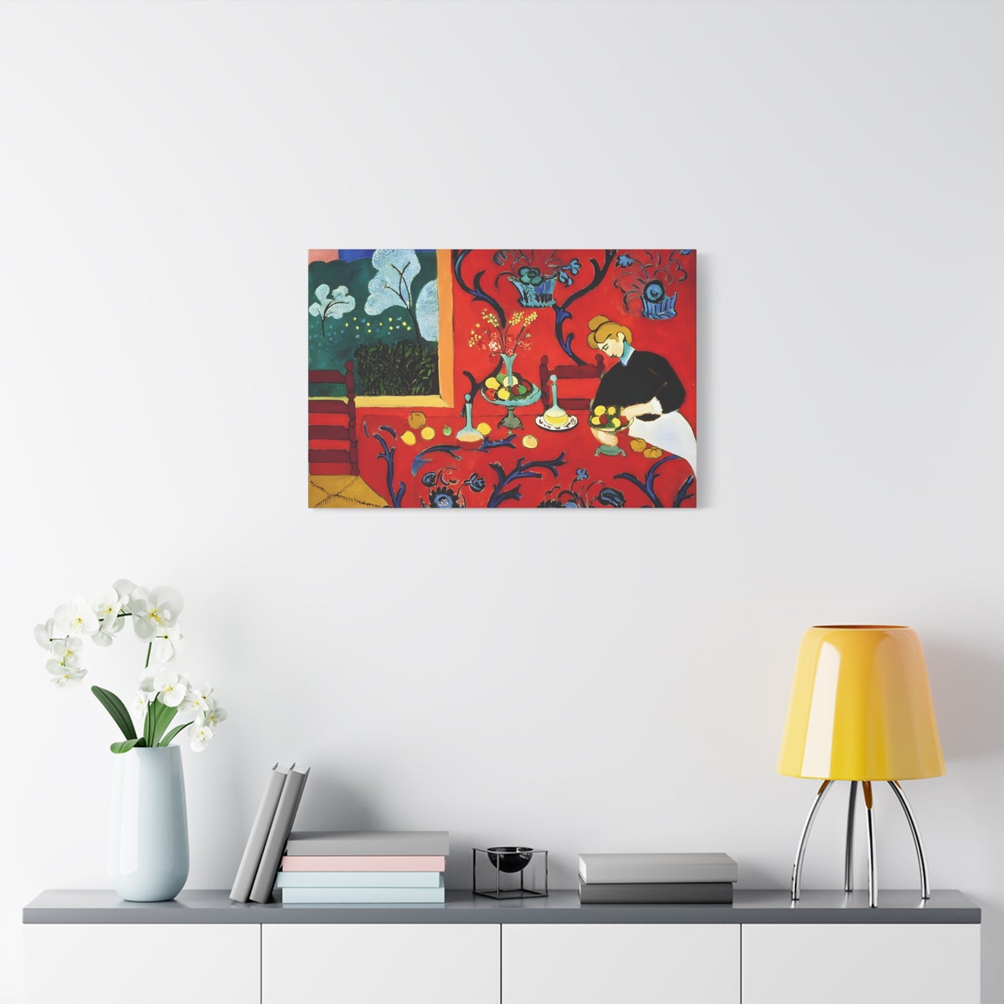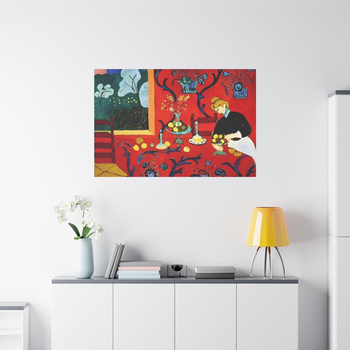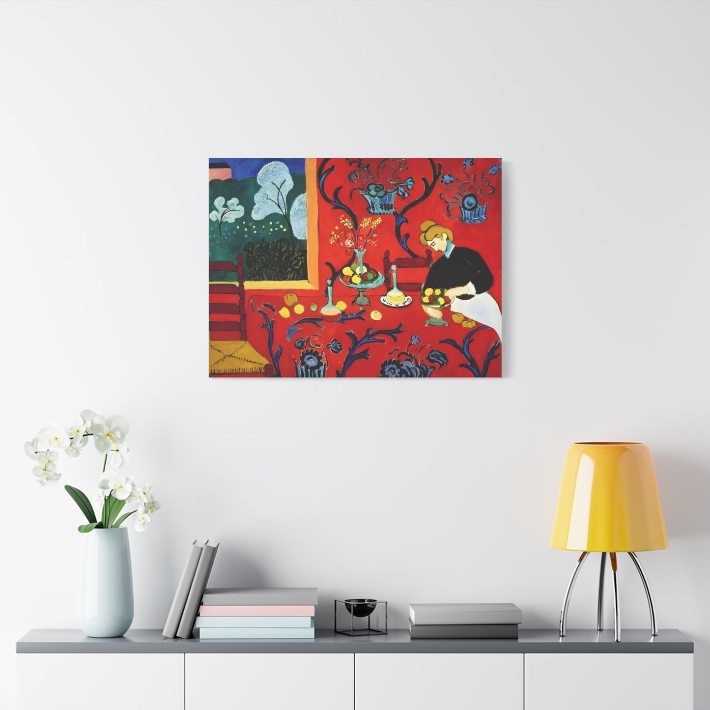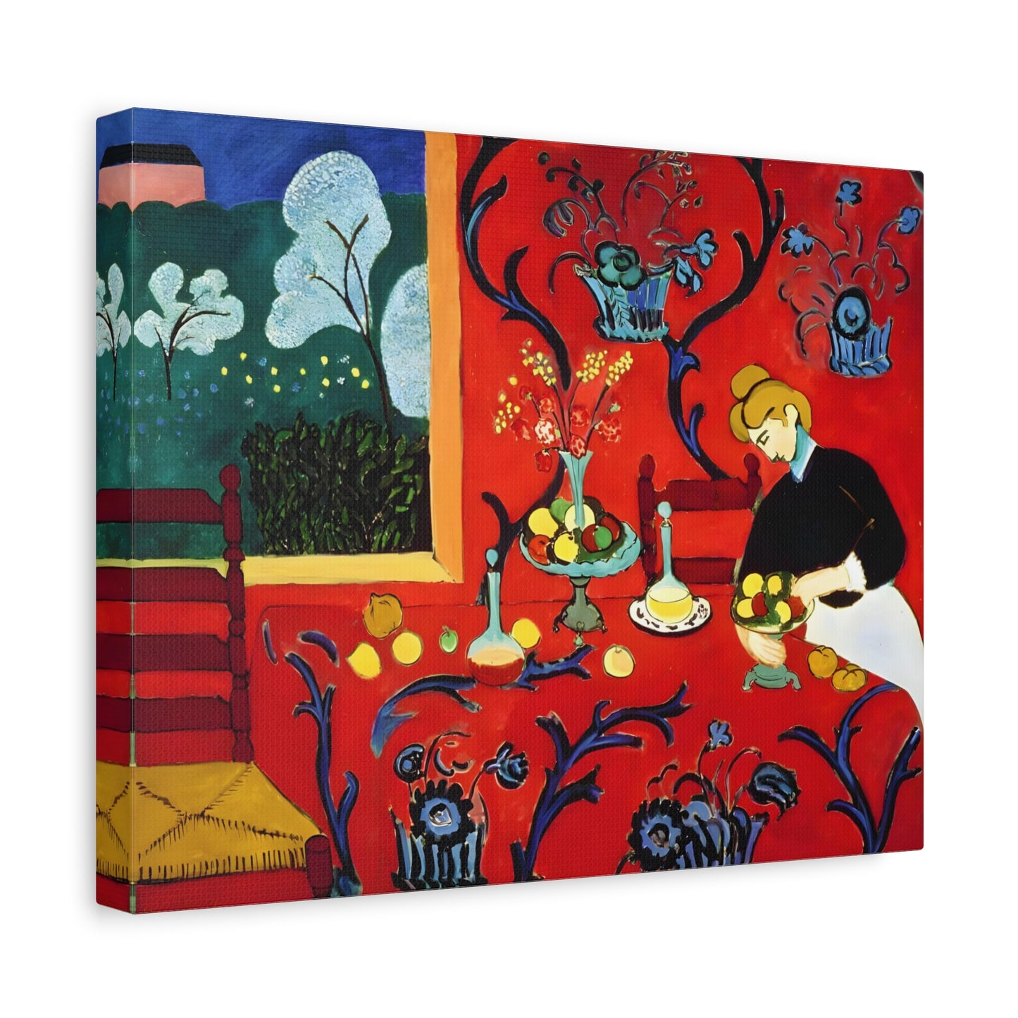 Introducing The Dessert: Harmony in Red by Henri Matisse, created in 1908. This vibrant and captivating artwork bursts with energy and life, instantly transforming any space into a visual feast for the senses. Matisse's bold use of red tones, intricate patterns, and sumptuous details create a harmonious composition that exudes warmth and opulence. The artwork's timeless elegance and its ability to infuse a room with a sense of luxury make it a must-have for art enthusiasts and interior design connoisseurs alike. With a replicated canvas of The Dessert: Harmony in Red, you can bring the exhilarating spirit of Matisse's masterpiece into your home, elevating your space to new heights of sophistication and artistic allure.