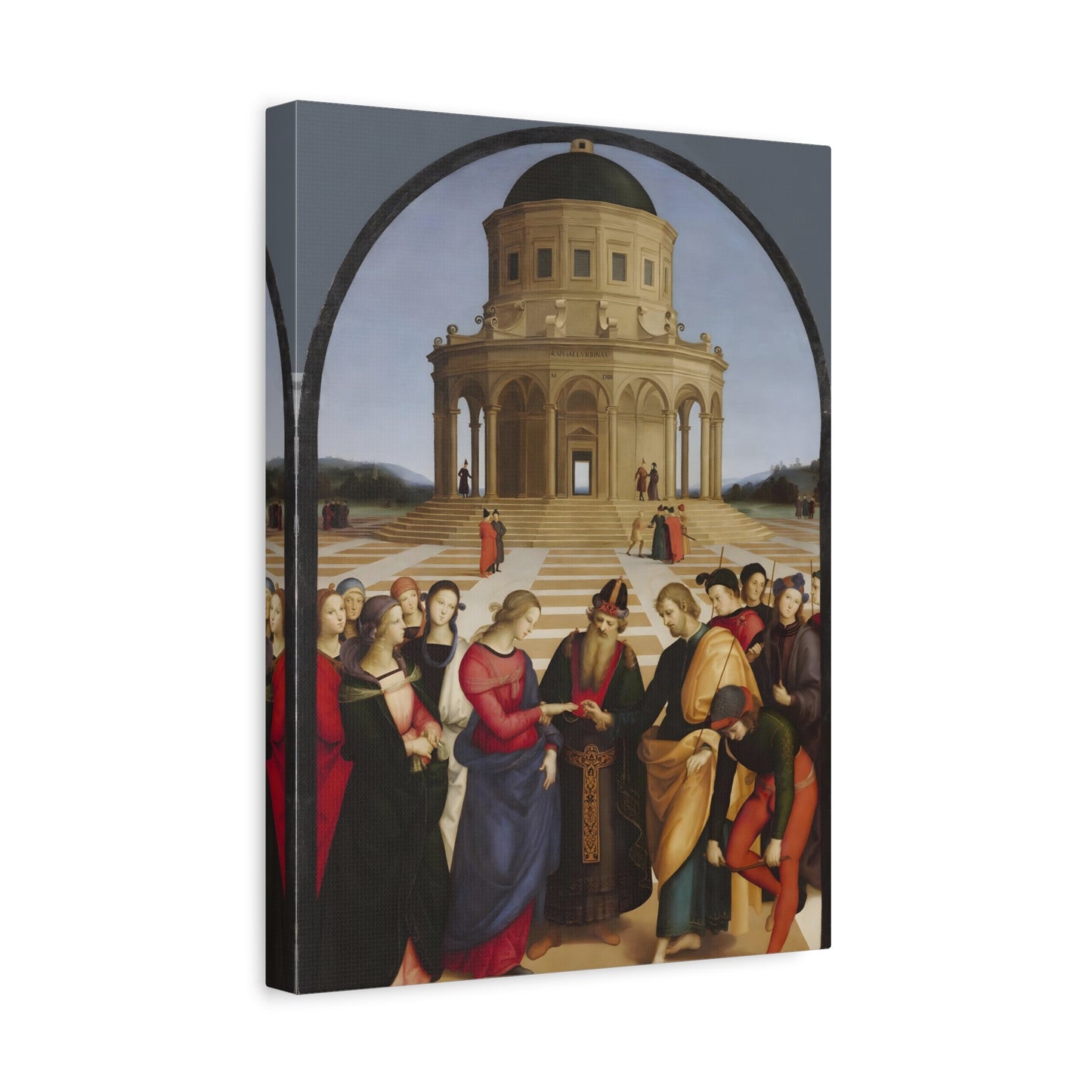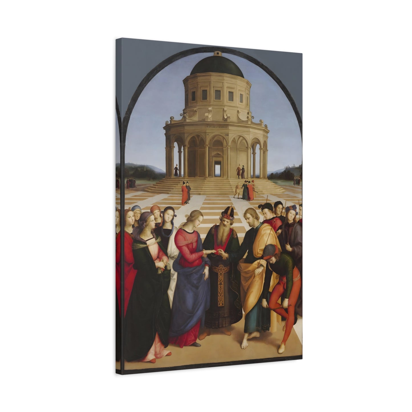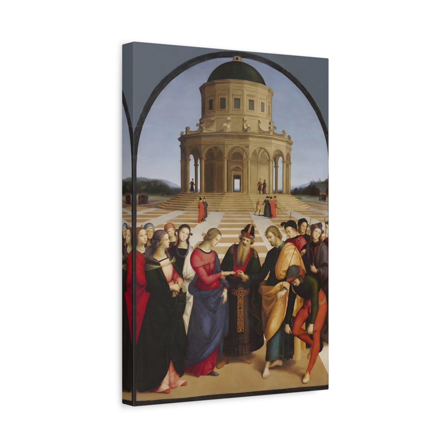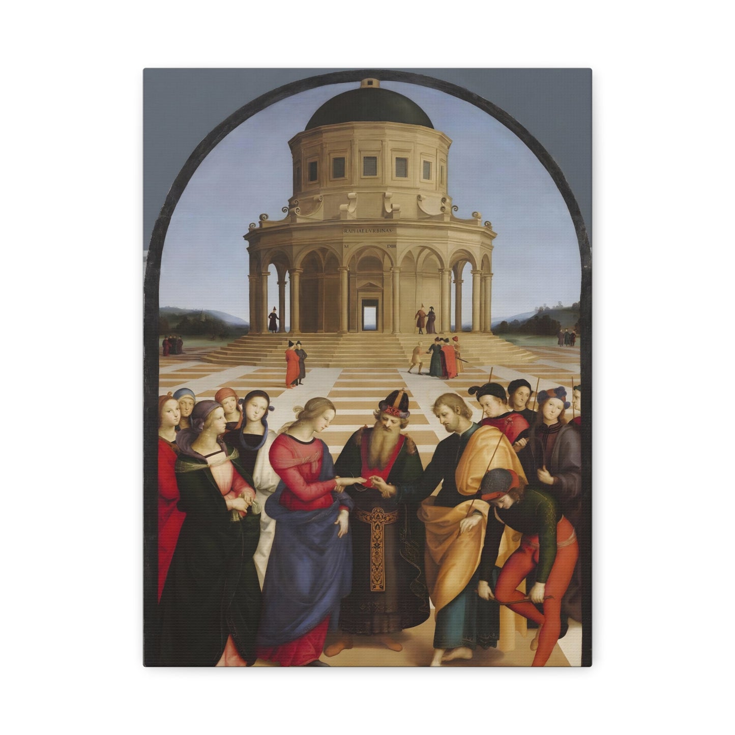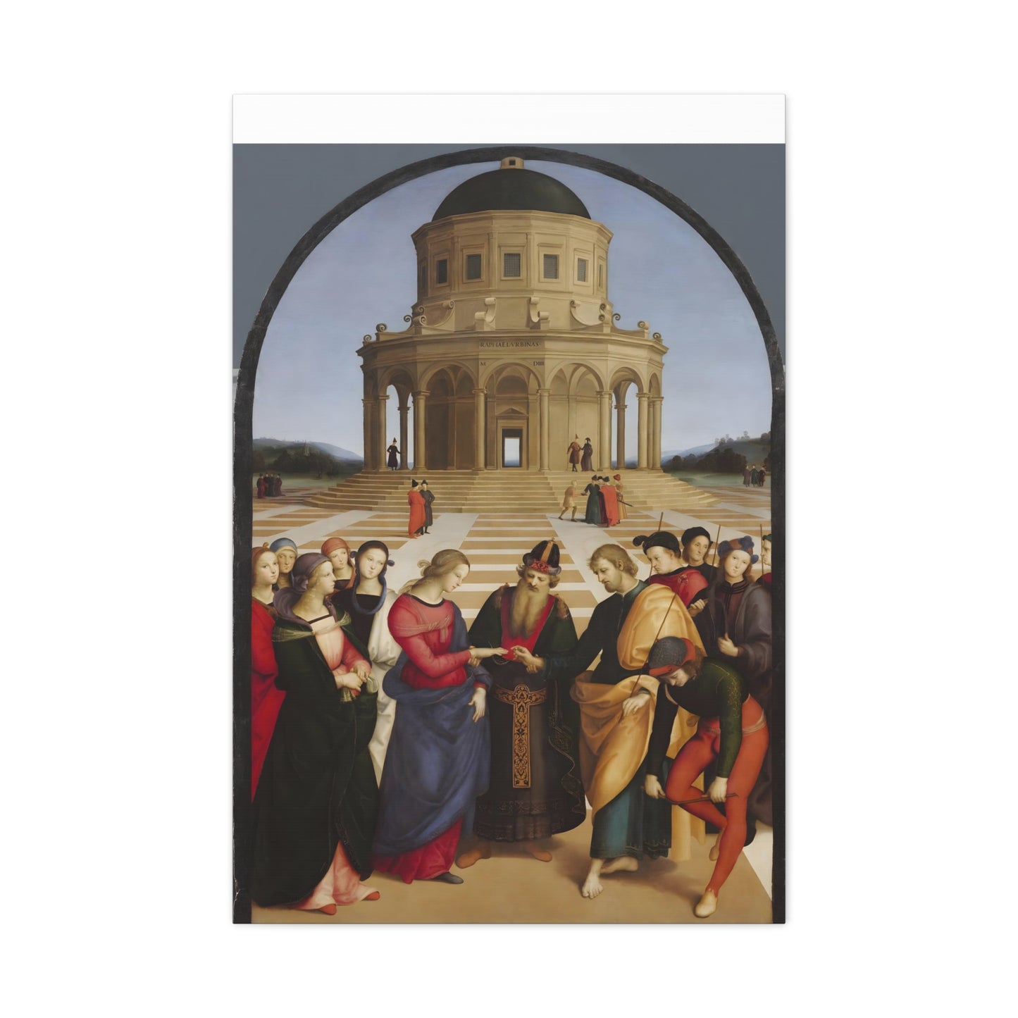 Experience the profound union of beauty and spirituality with Raphael's masterpiece, The Marriage of the Virgin, created in 1504. This captivating artwork captures the sacred moment of the Virgin Mary's betrothal to Joseph, radiating with elegance and grace. The painting's meticulous attention to detail, vibrant colors, and harmonious composition transport you to the heart of the Renaissance. By owning a replicated version of this iconic artwork, you invite a touch of divine artistry into your home. Let the harmonious union depicted in The Marriage of the Virgin inspire love, devotion, and a sense of wonder every time you gaze upon it. Elevate your living space with this remarkable piece and revel in the timeless beauty it exudes.