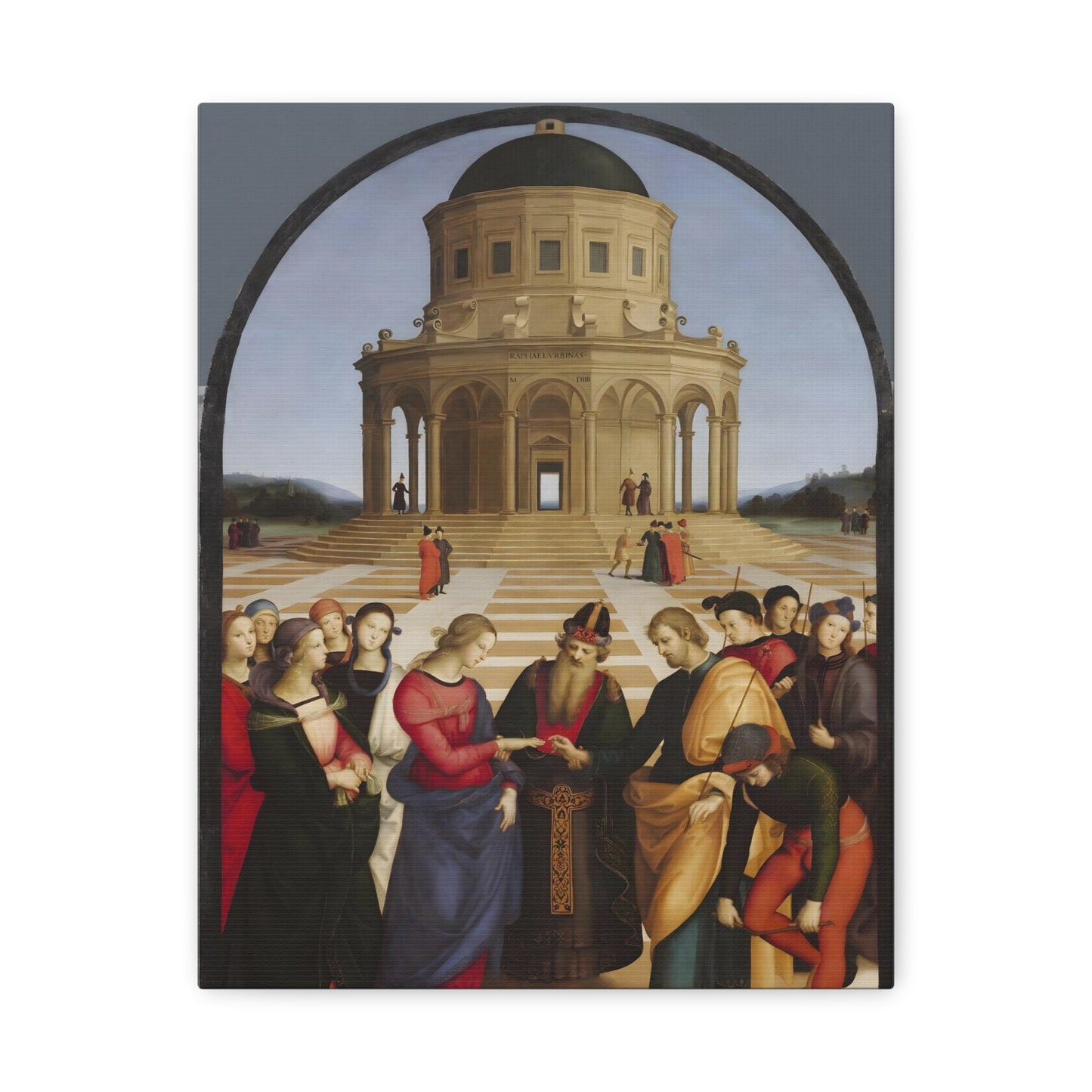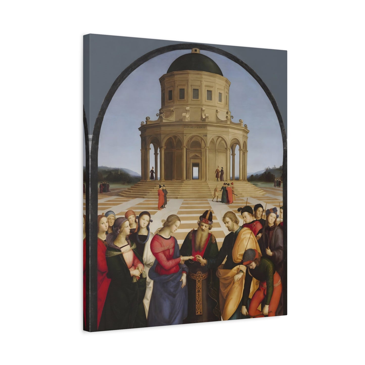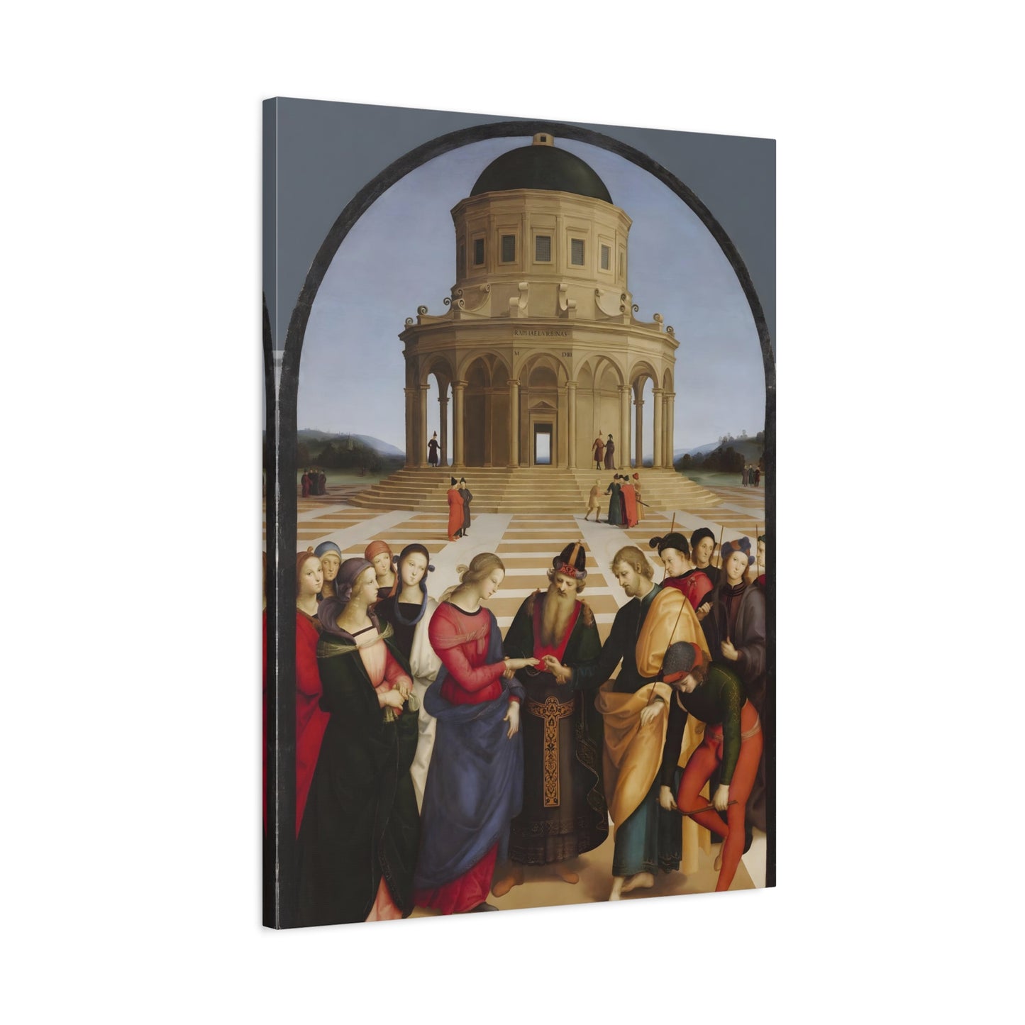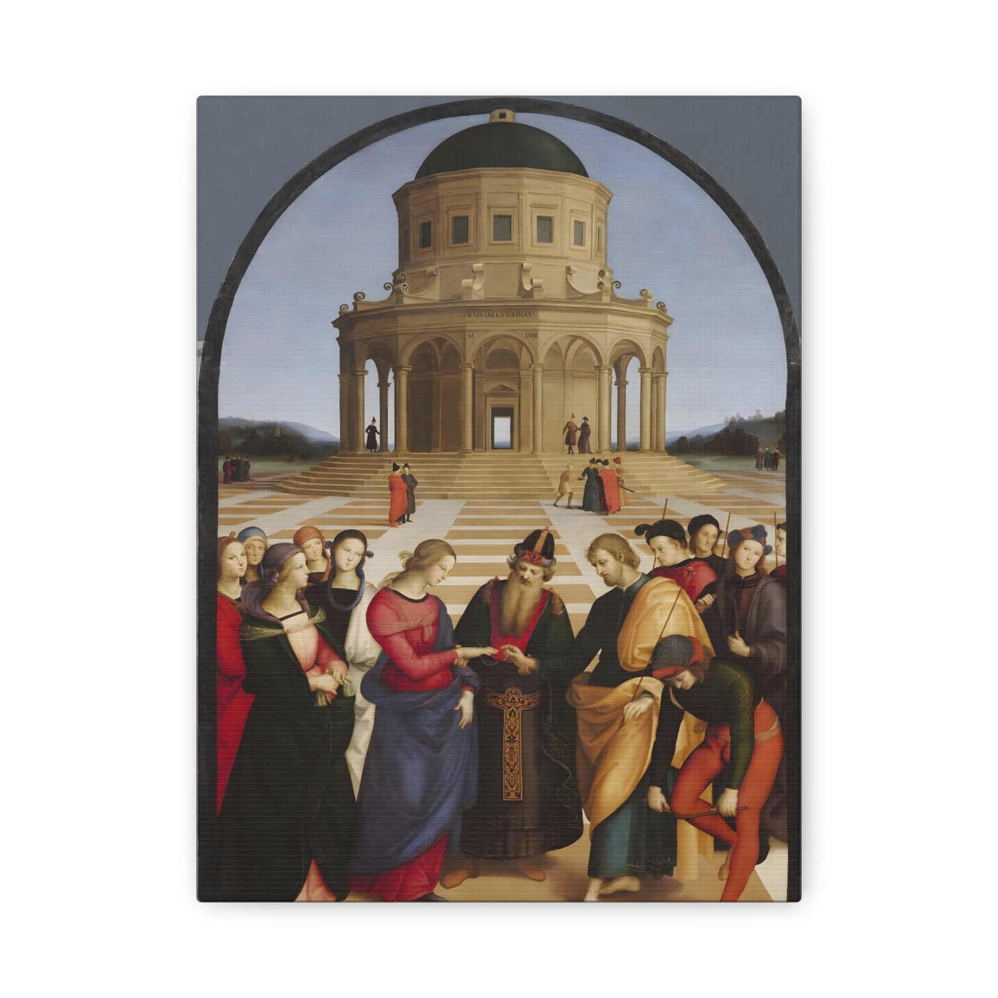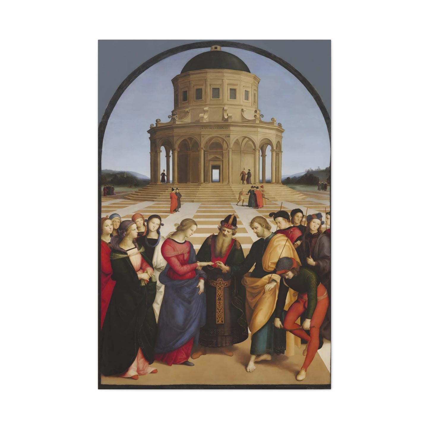 Experience the profound union of beauty and spirituality with Raphael's masterpiece, The Marriage of the Virgin, created in 1504. This captivating artwork captures the sacred moment of the Virgin Mary's betrothal to Joseph, radiating with elegance and grace. The painting's meticulous attention to detail, vibrant colors, and harmonious composition transport you to the heart of the Renaissance. By owning a replicated version of this iconic artwork, you invite a touch of divine artistry into your home. Let the harmonious union depicted in The Marriage of the Virgin inspire love, devotion, and a sense of wonder every time you gaze upon it. Elevate your living space with this remarkable piece and revel in the timeless beauty it exudes.