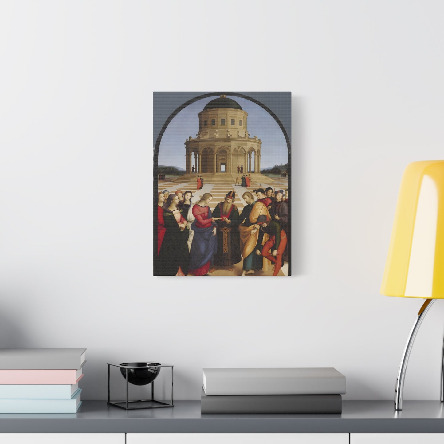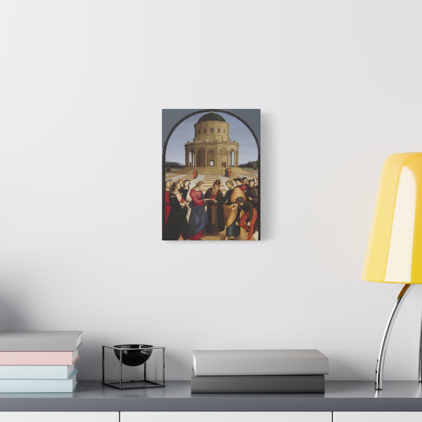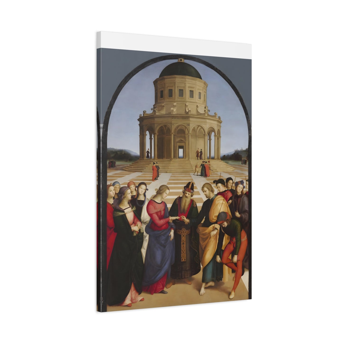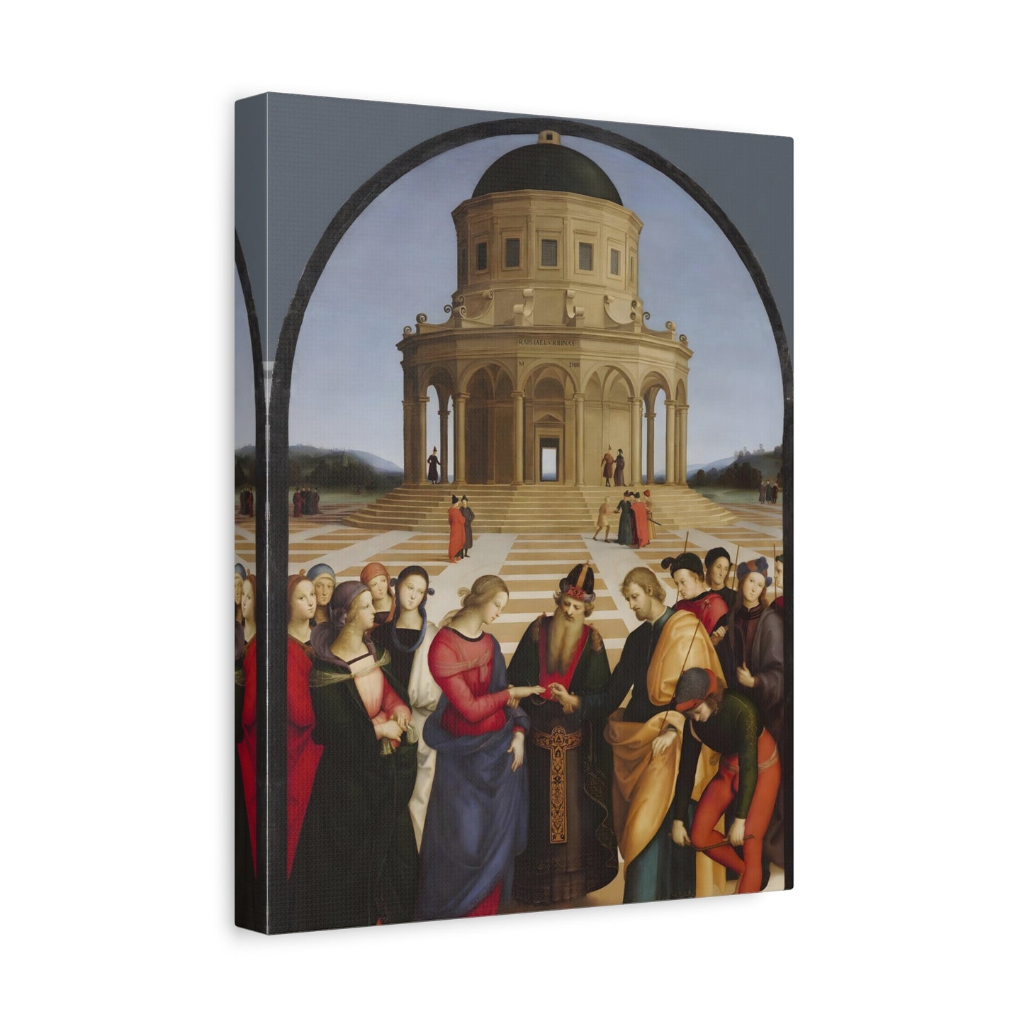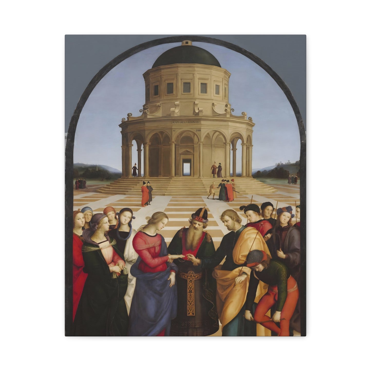 Experience the profound union of beauty and spirituality with Raphael's masterpiece, The Marriage of the Virgin, created in 1504. This captivating artwork captures the sacred moment of the Virgin Mary's betrothal to Joseph, radiating with elegance and grace. The painting's meticulous attention to detail, vibrant colors, and harmonious composition transport you to the heart of the Renaissance. By owning a replicated version of this iconic artwork, you invite a touch of divine artistry into your home. Let the harmonious union depicted in The Marriage of the Virgin inspire love, devotion, and a sense of wonder every time you gaze upon it. Elevate your living space with this remarkable piece and revel in the timeless beauty it exudes.
