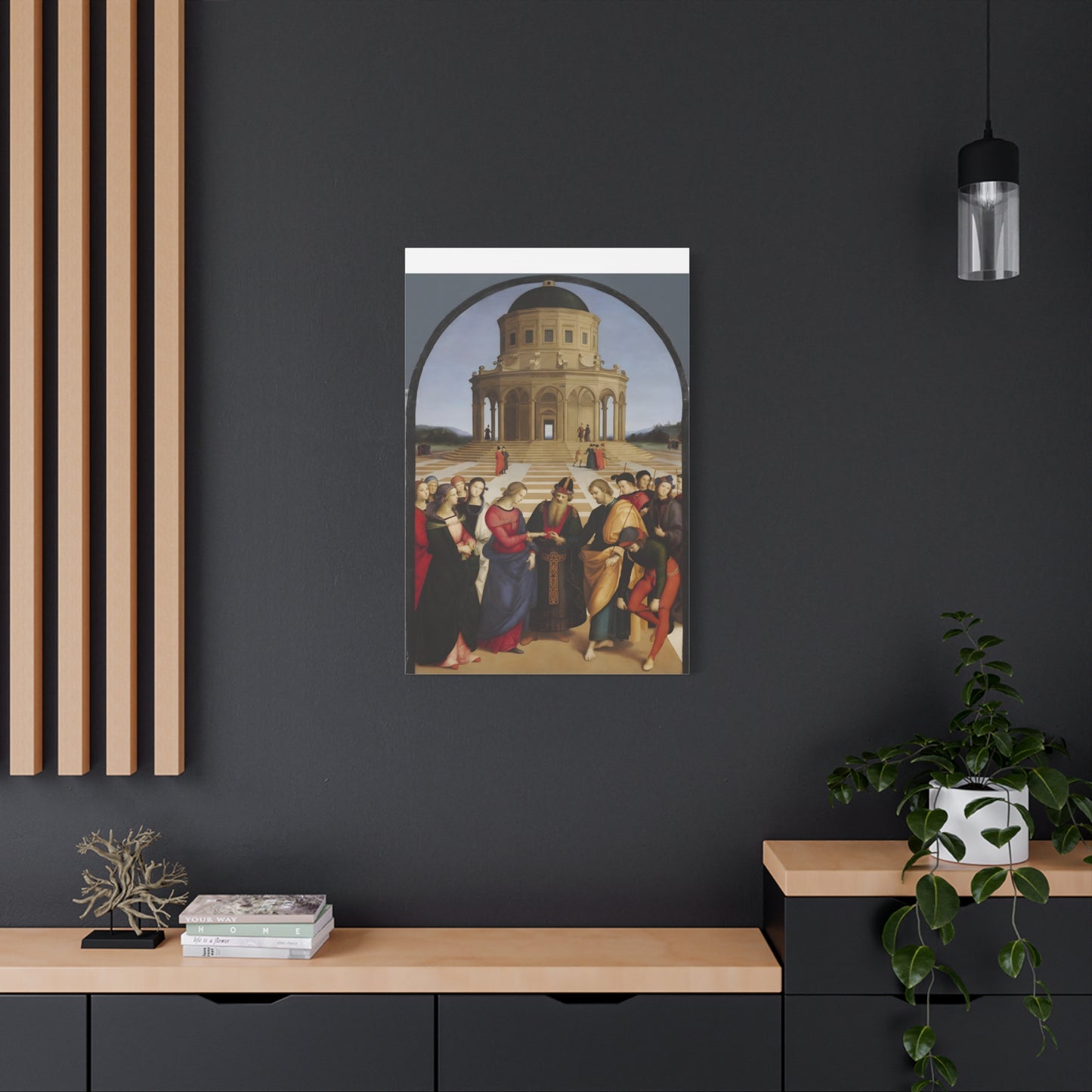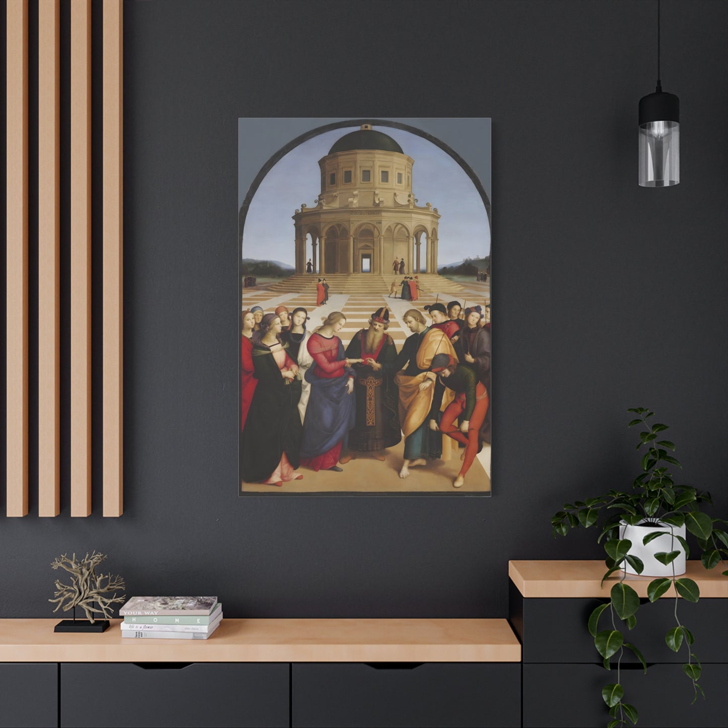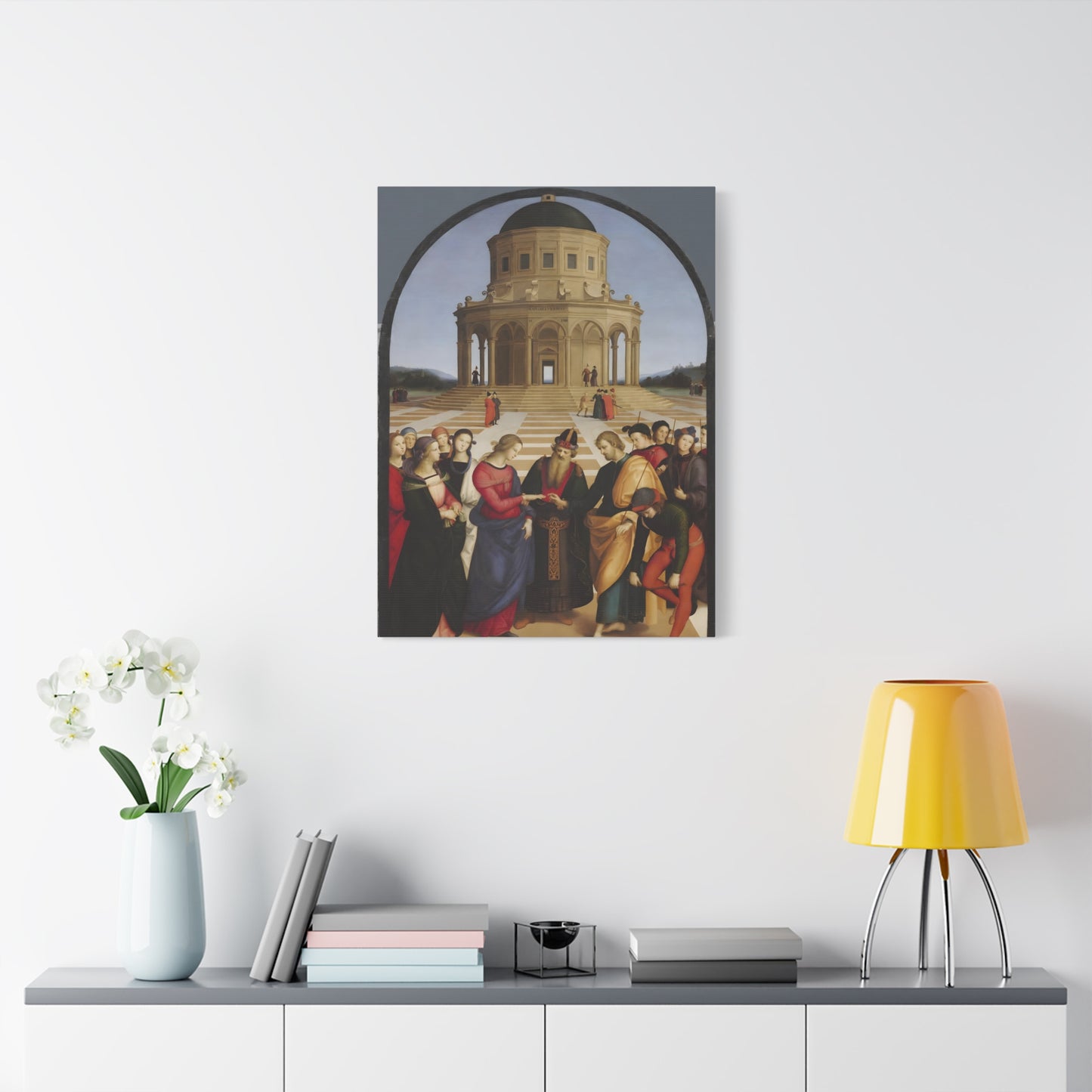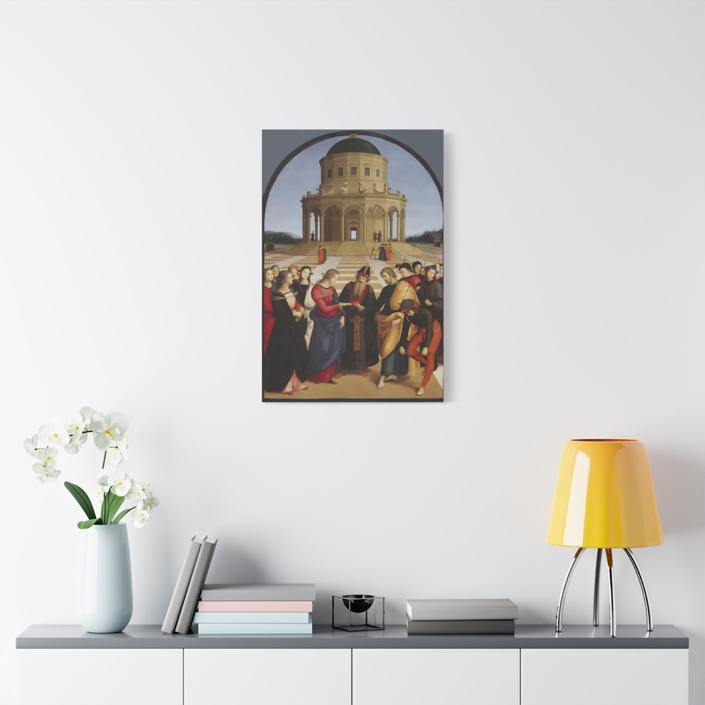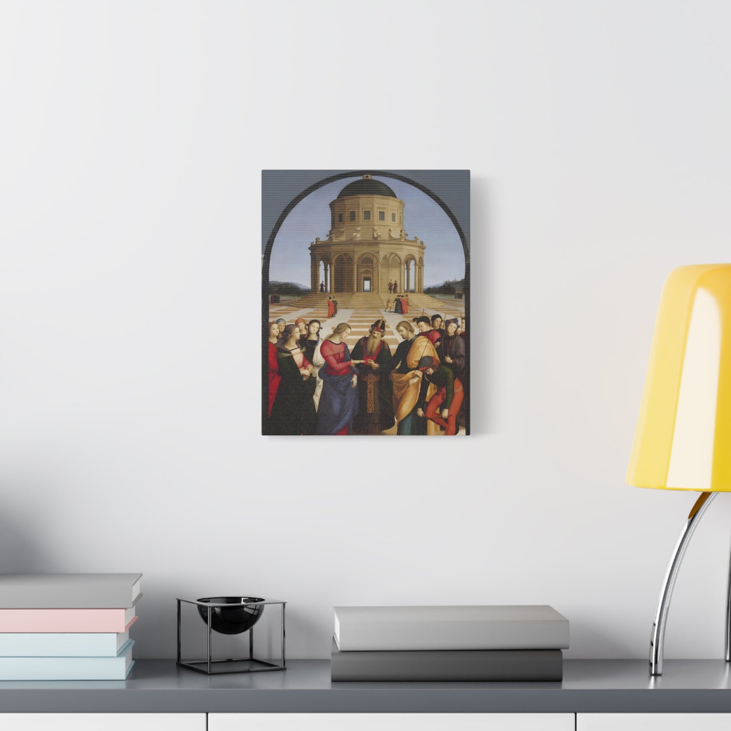 Experience the profound union of beauty and spirituality with Raphael's masterpiece, The Marriage of the Virgin, created in 1504. This captivating artwork captures the sacred moment of the Virgin Mary's betrothal to Joseph, radiating with elegance and grace. The painting's meticulous attention to detail, vibrant colors, and harmonious composition transport you to the heart of the Renaissance. By owning a replicated version of this iconic artwork, you invite a touch of divine artistry into your home. Let the harmonious union depicted in The Marriage of the Virgin inspire love, devotion, and a sense of wonder every time you gaze upon it. Elevate your living space with this remarkable piece and revel in the timeless beauty it exudes.