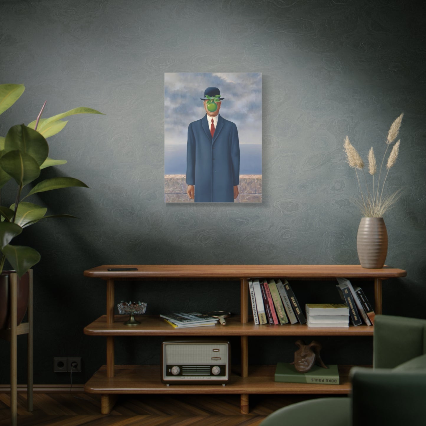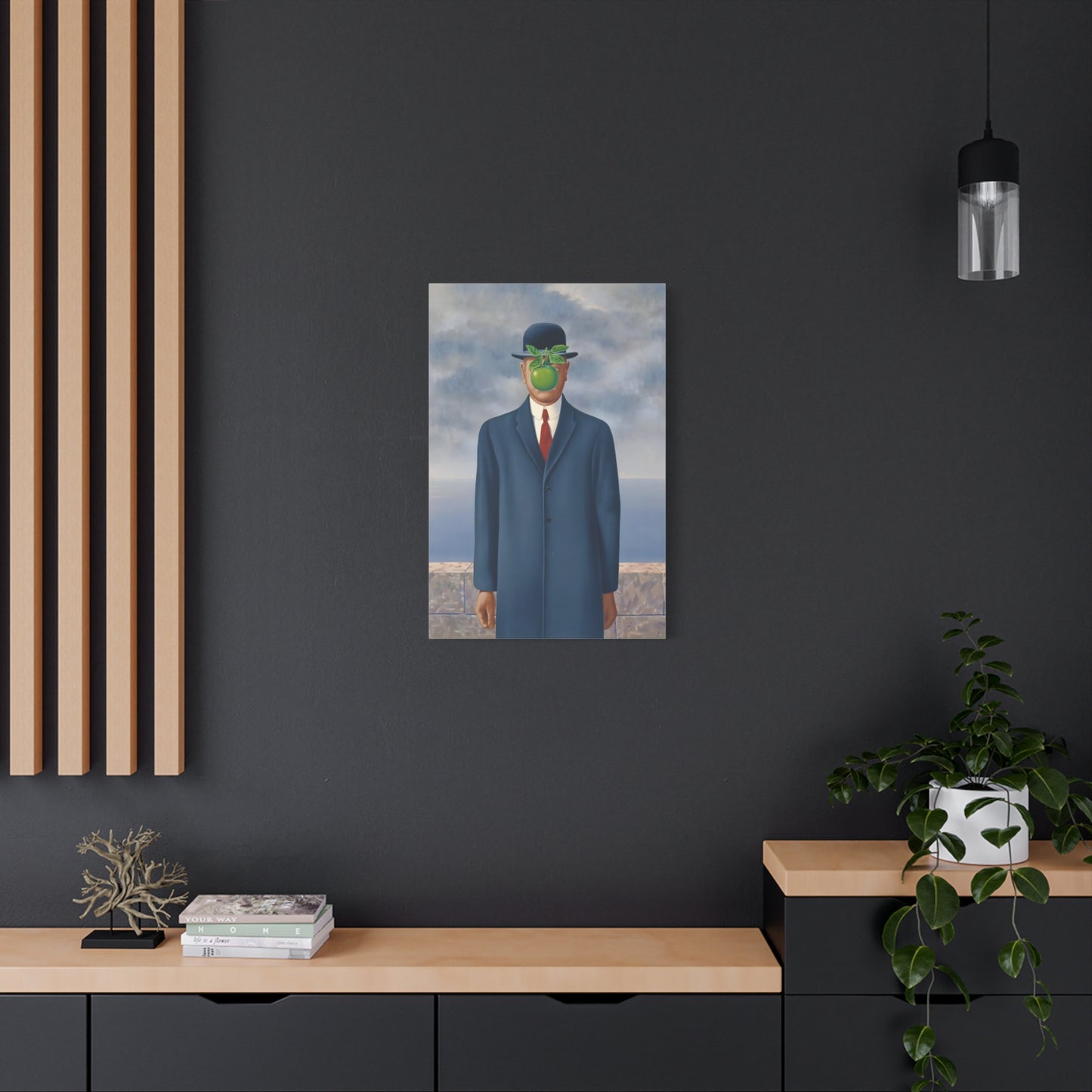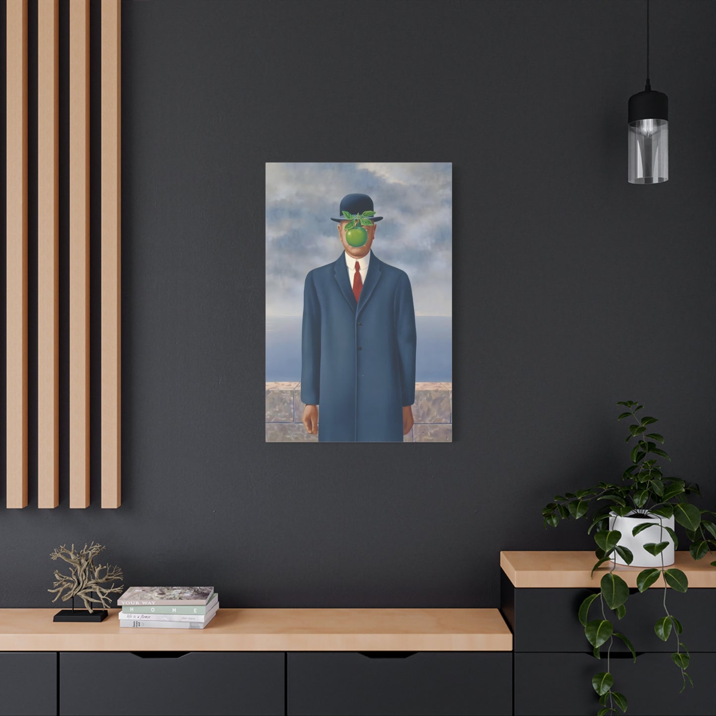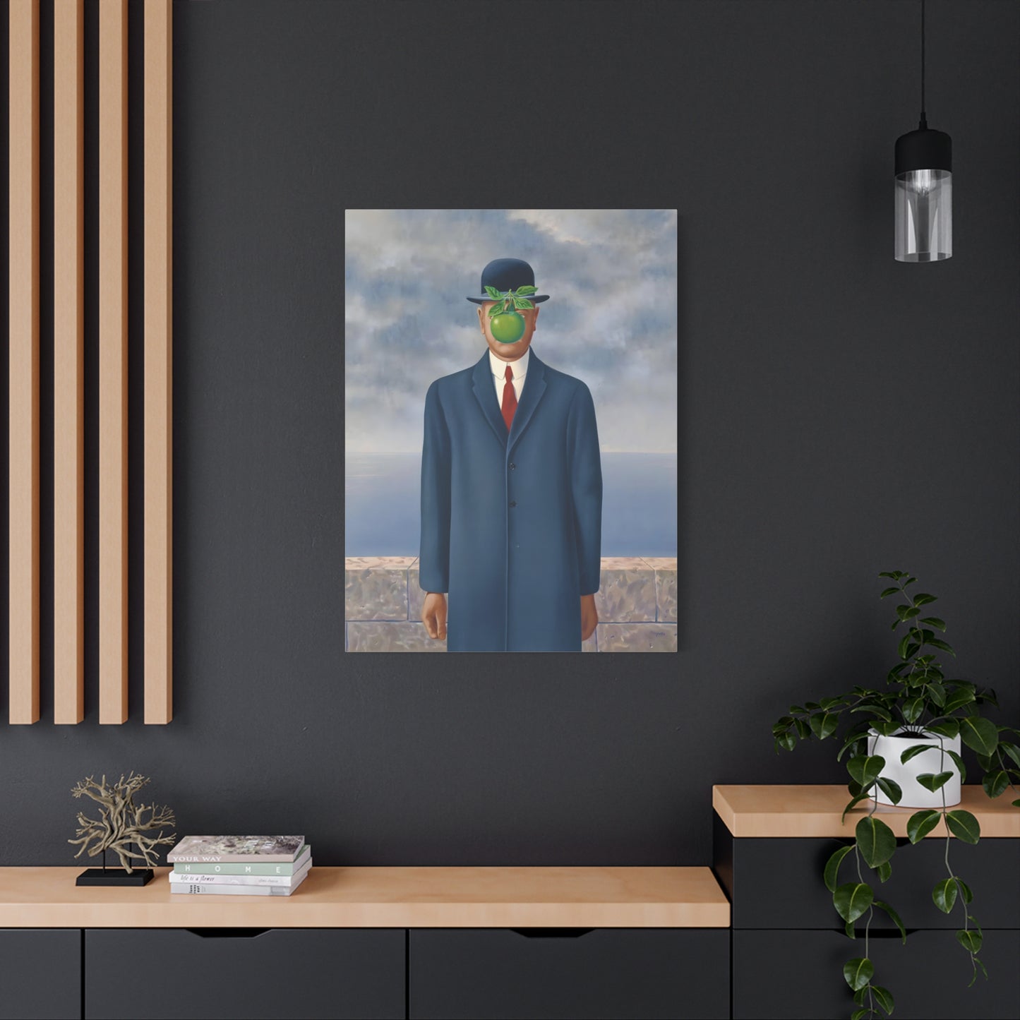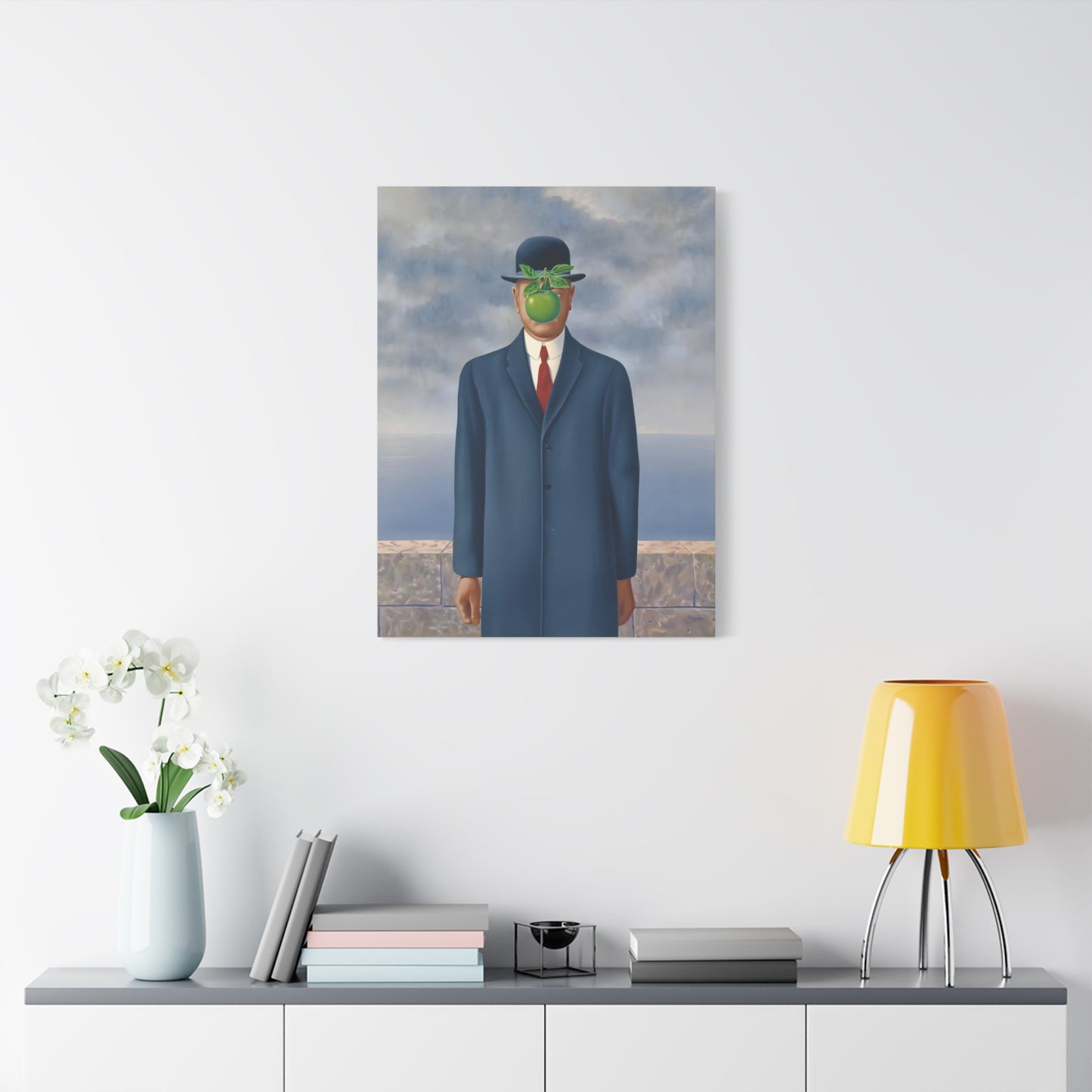 The Son of Man, created in 1964 by the renowned surrealist artist René Magritte, is a captivating masterpiece that will ignite your imagination and transform your living space into a realm of mystery and wonder. This iconic artwork features a sharply dressed man in a bowler hat, his face obscured by a hovering green apple. Its enigmatic composition beckons you to explore the depths of symbolism and invites contemplation on themes of identity, perception, and hidden truths. Owning a canvas replication of The Son of Man is like owning a portal to the surreal world of Magritte, a gateway to inspiration and intellectual stimulation. Elevate your home with this conversation-starting gem that will enchant all who lay eyes upon it.