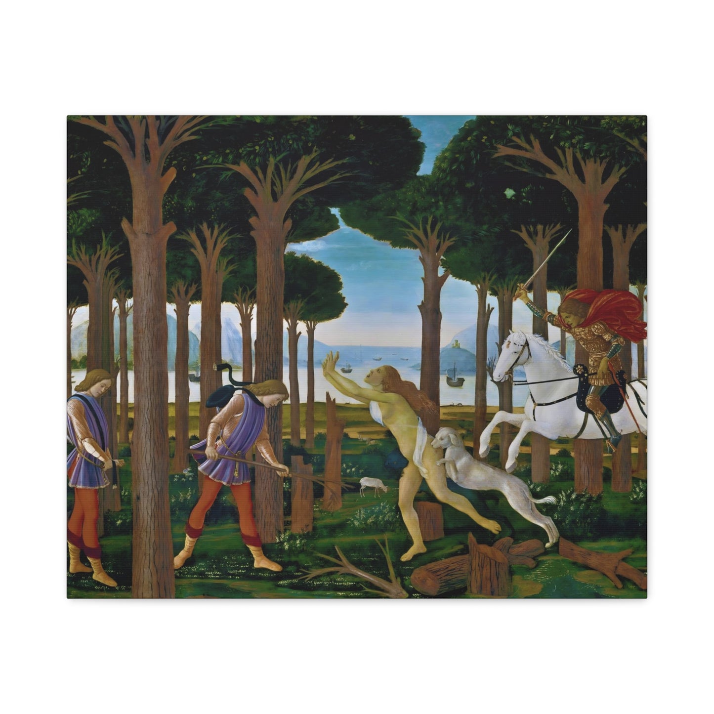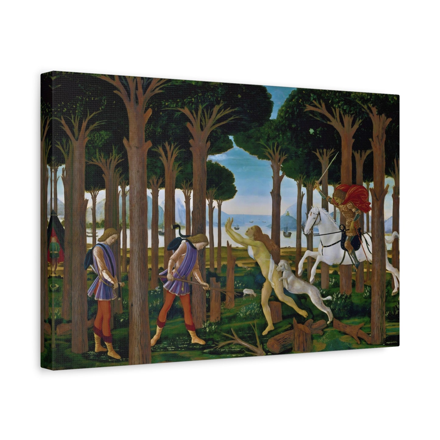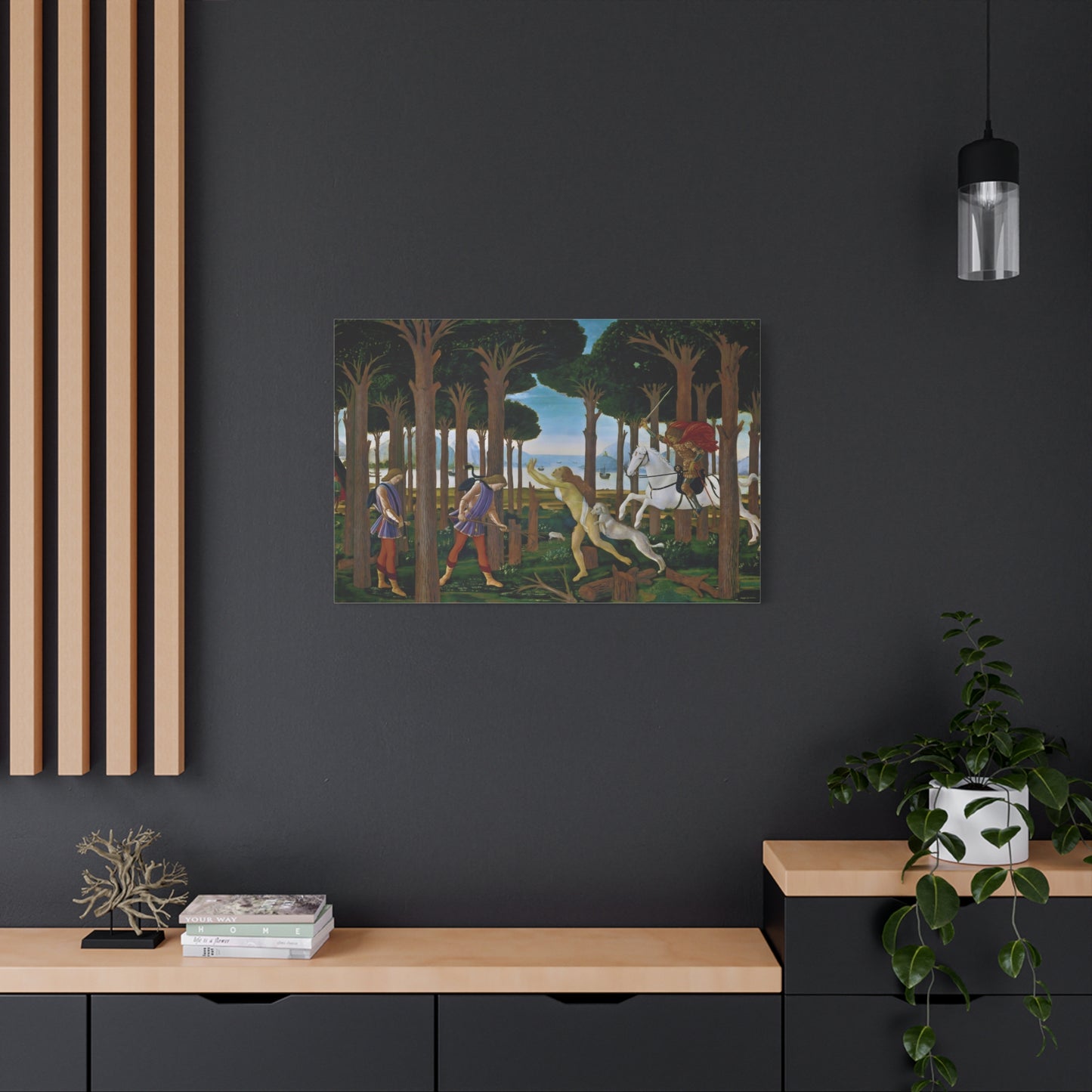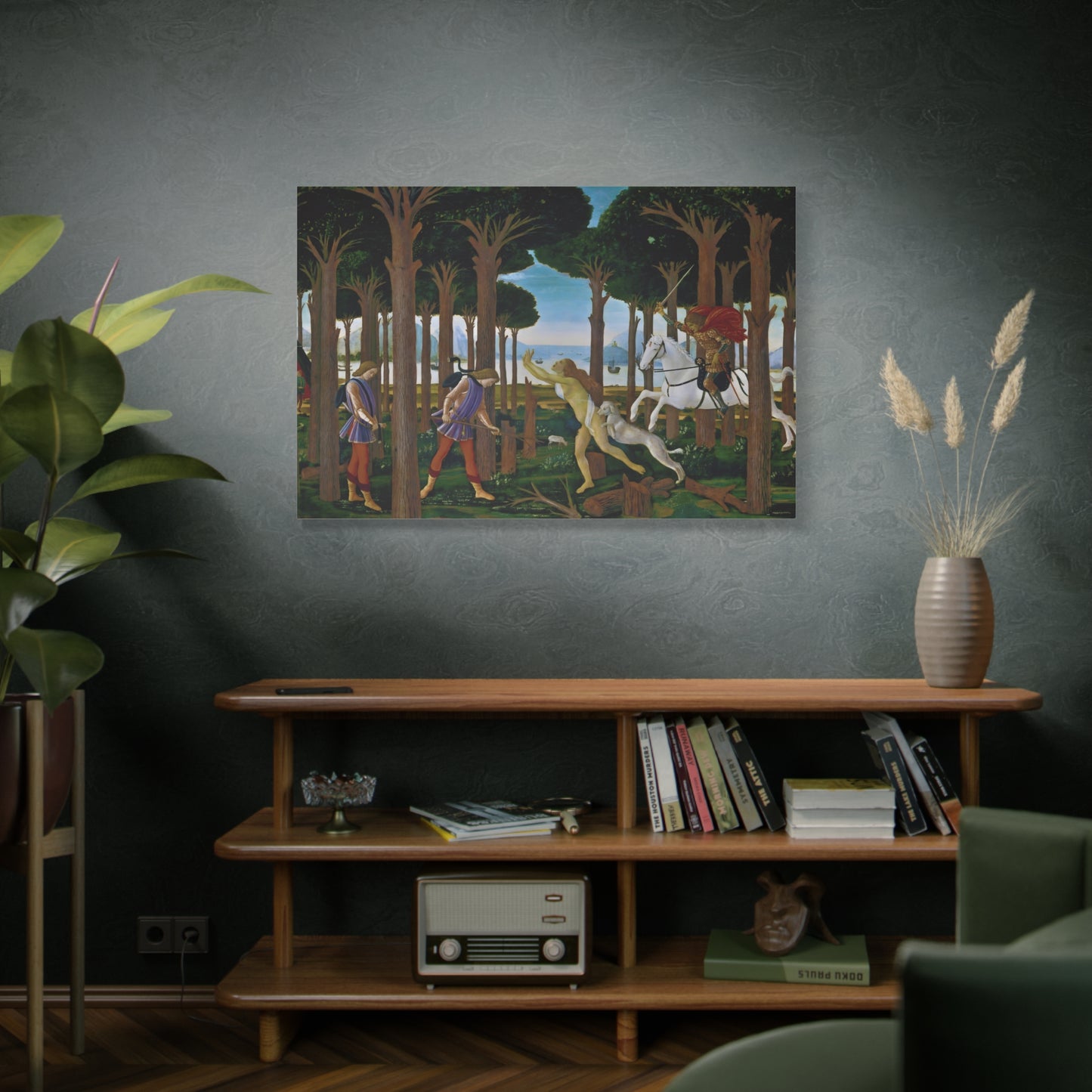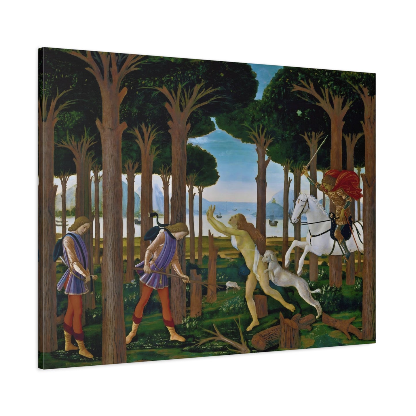 Step into the enchanting world of Sandro Botticelli's The Story of Nastagio degli Onesti, a mesmerizing artwork created in the year 1483. Experience the tale of love, heartbreak, and redemption brought to life on this exquisite canvas art replication. Immerse yourself in the intricate details and masterful storytelling as Botticelli captures the emotions and complexities of the narrative. This artwork is a conversation starter, a visual feast that will leave your guests in awe. Let the vibrant colors and compelling composition transport you to another time and place, creating a captivating atmosphere in your home. Own this extraordinary piece and infuse your space with the timeless beauty and narrative power of Botticelli's artistry.
