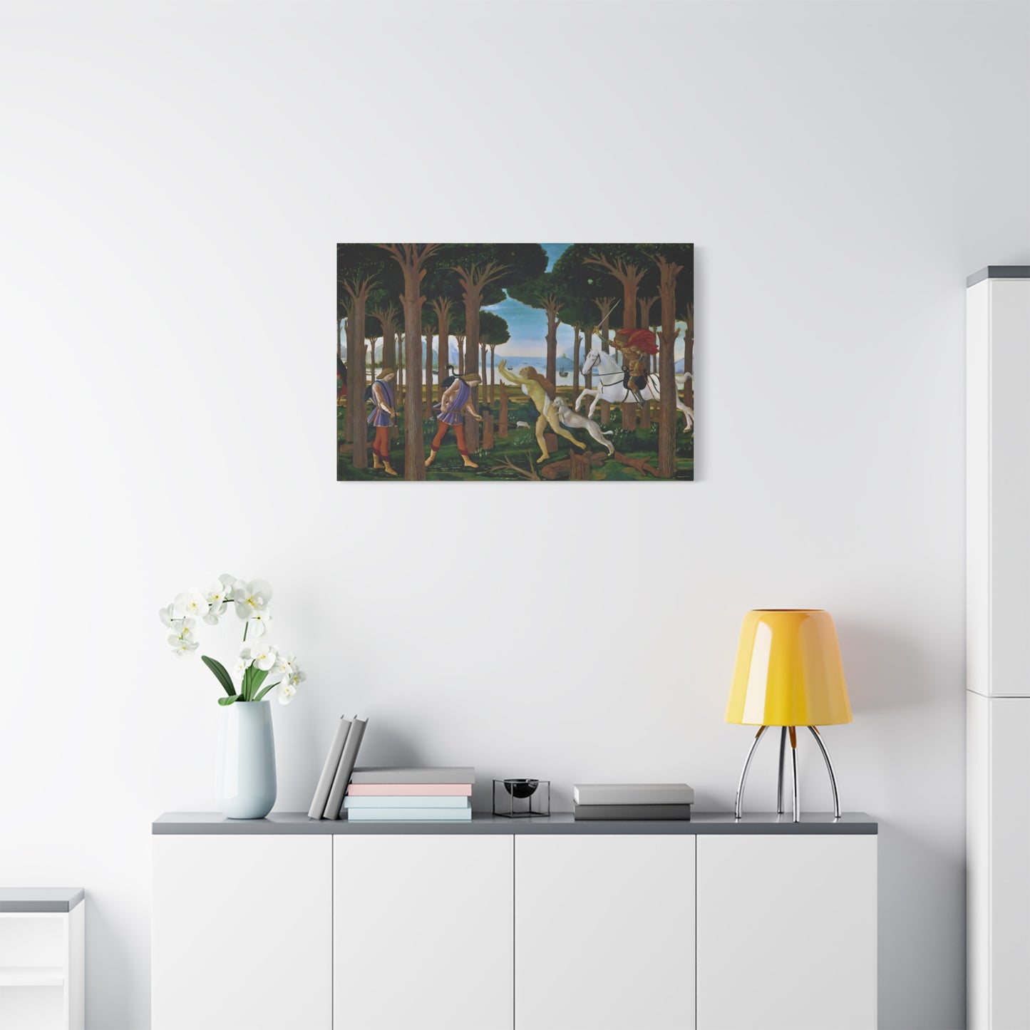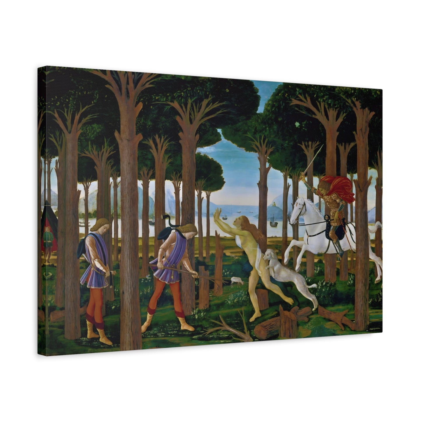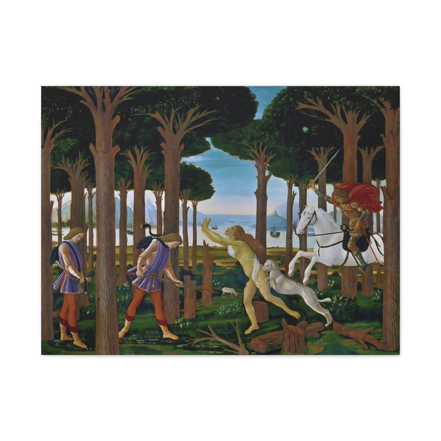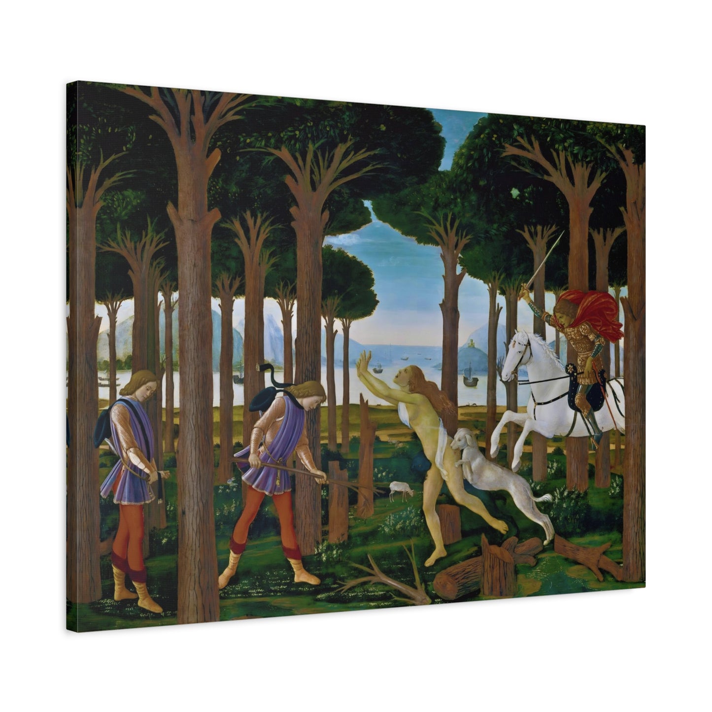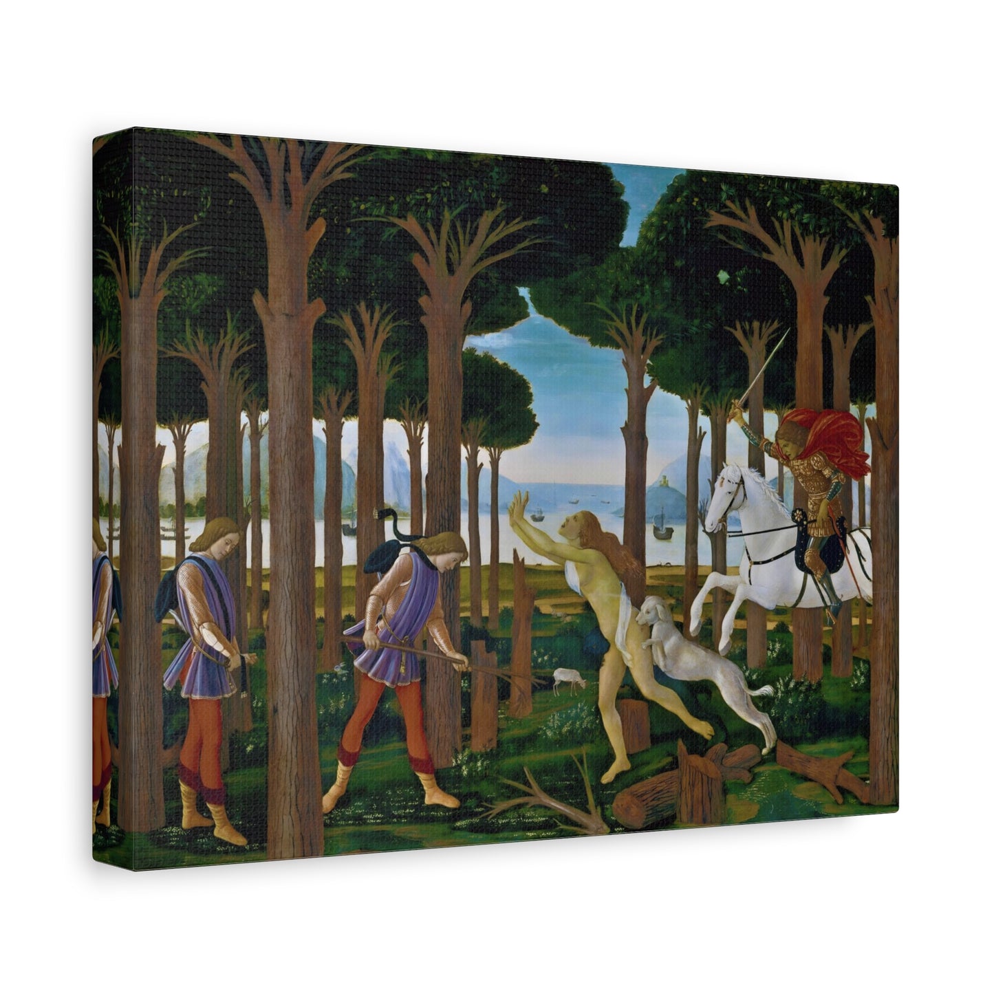 Step into the enchanting world of Sandro Botticelli's The Story of Nastagio degli Onesti, a mesmerizing artwork created in the year 1483. Experience the tale of love, heartbreak, and redemption brought to life on this exquisite canvas art replication. Immerse yourself in the intricate details and masterful storytelling as Botticelli captures the emotions and complexities of the narrative. This artwork is a conversation starter, a visual feast that will leave your guests in awe. Let the vibrant colors and compelling composition transport you to another time and place, creating a captivating atmosphere in your home. Own this extraordinary piece and infuse your space with the timeless beauty and narrative power of Botticelli's artistry.