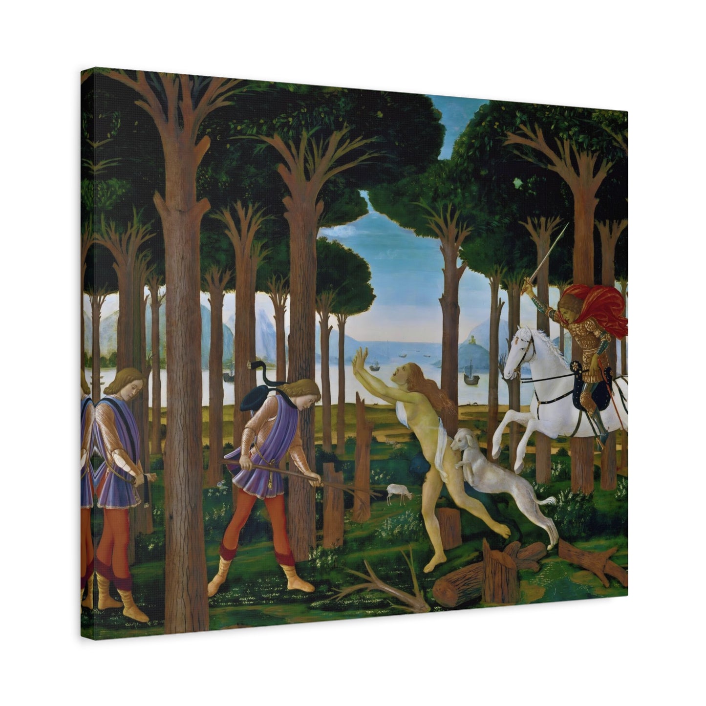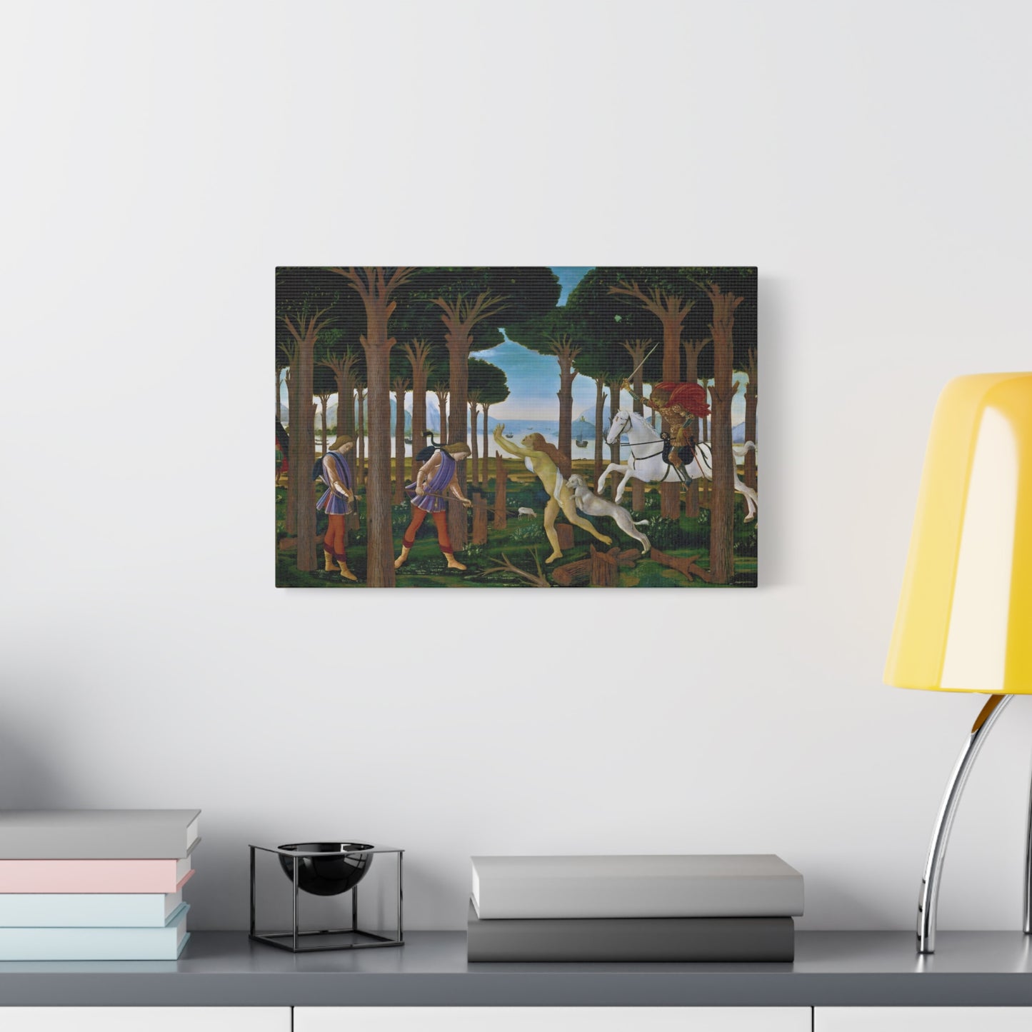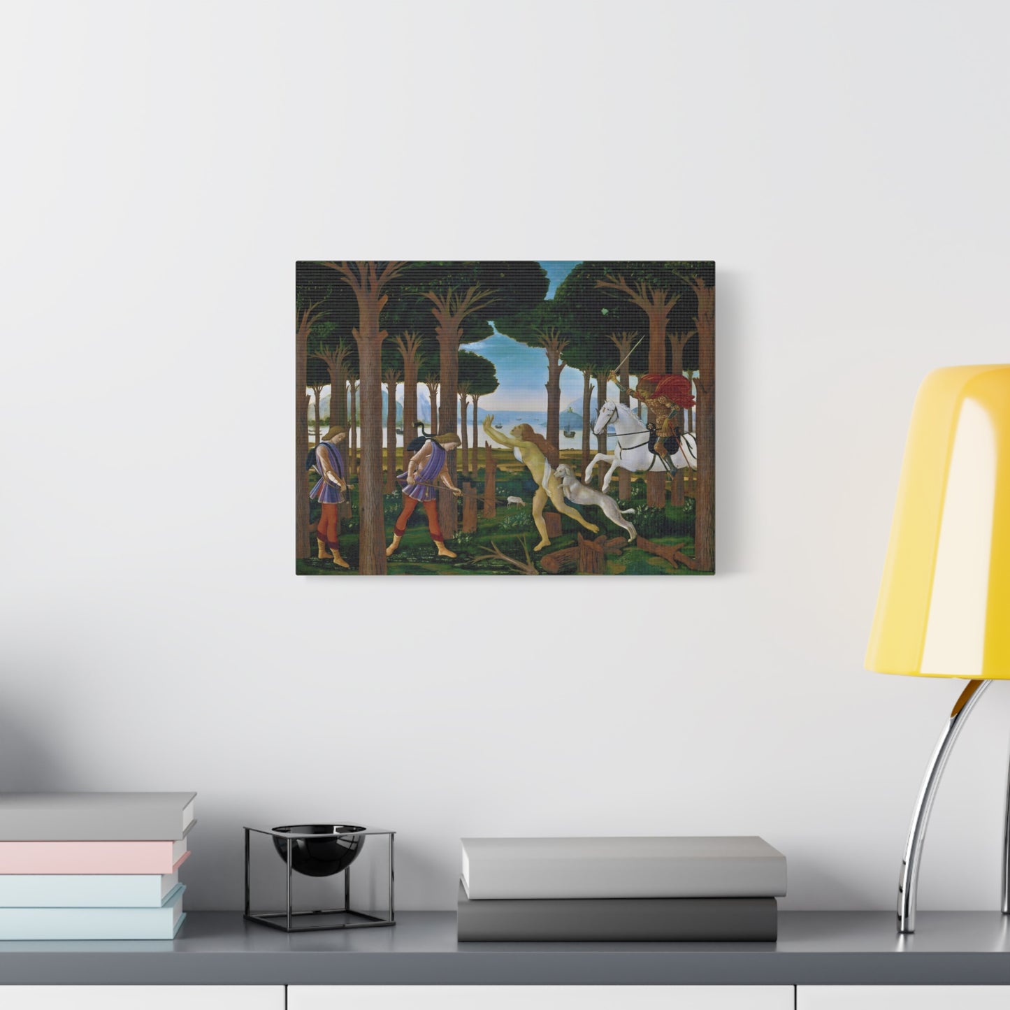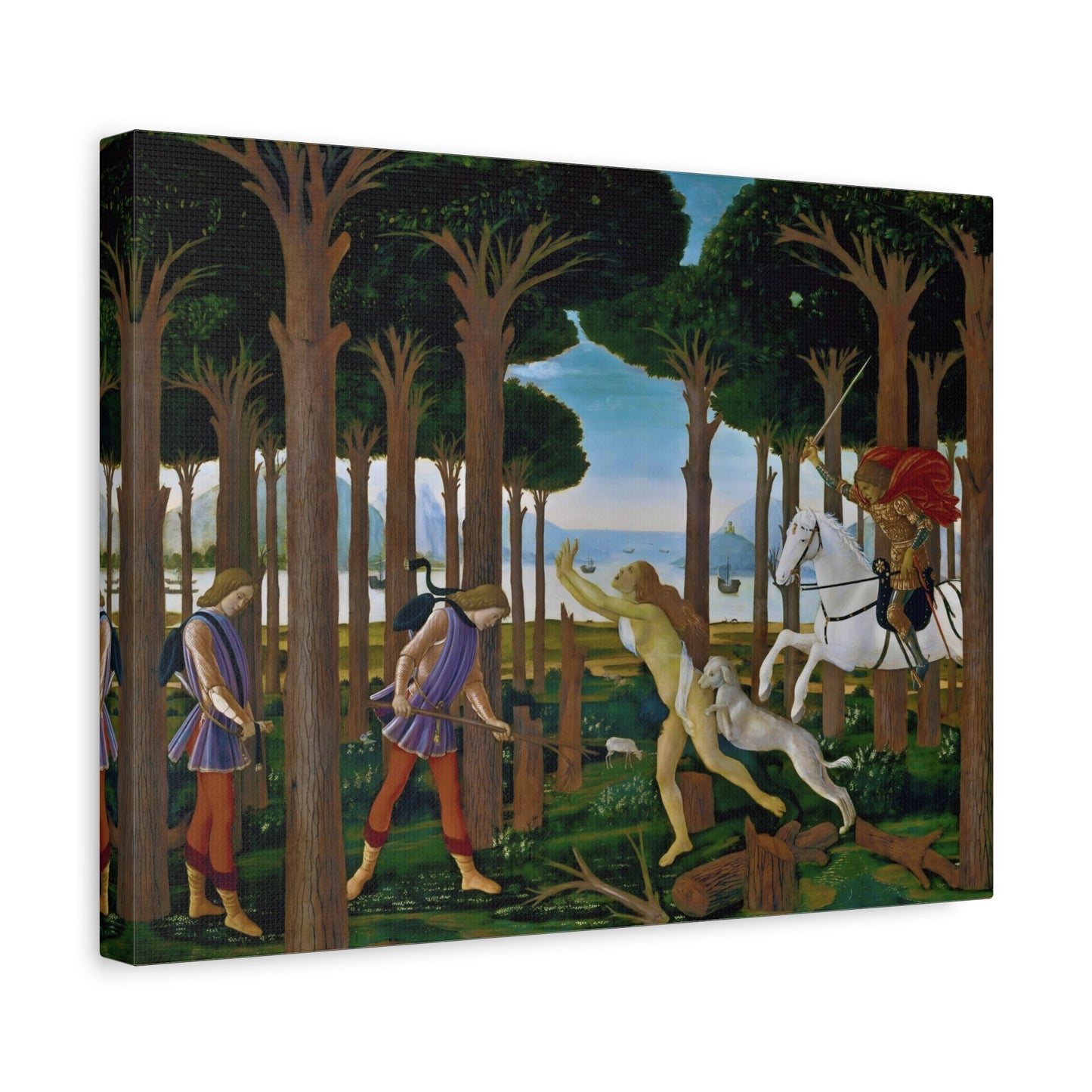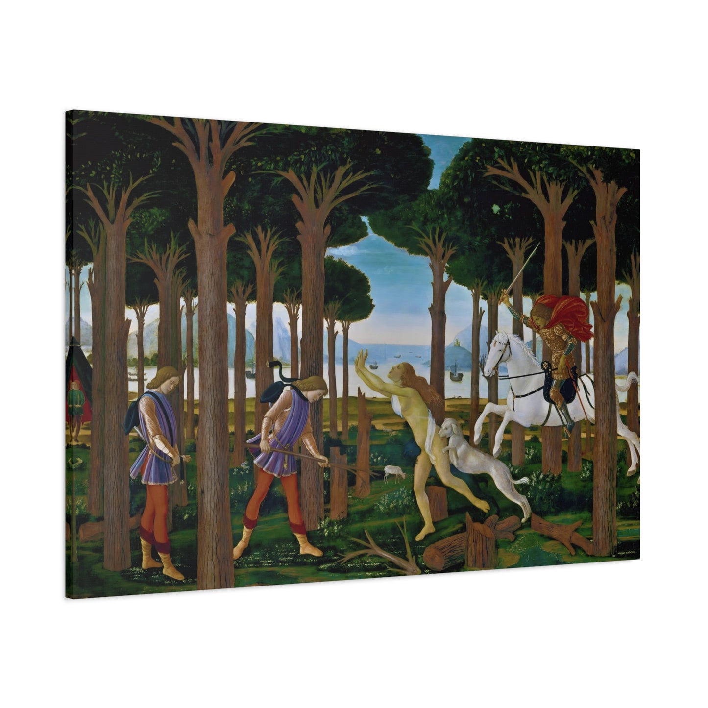 Step into the enchanting world of Sandro Botticelli's The Story of Nastagio degli Onesti, a mesmerizing artwork created in the year 1483. Experience the tale of love, heartbreak, and redemption brought to life on this exquisite canvas art replication. Immerse yourself in the intricate details and masterful storytelling as Botticelli captures the emotions and complexities of the narrative. This artwork is a conversation starter, a visual feast that will leave your guests in awe. Let the vibrant colors and compelling composition transport you to another time and place, creating a captivating atmosphere in your home. Own this extraordinary piece and infuse your space with the timeless beauty and narrative power of Botticelli's artistry.