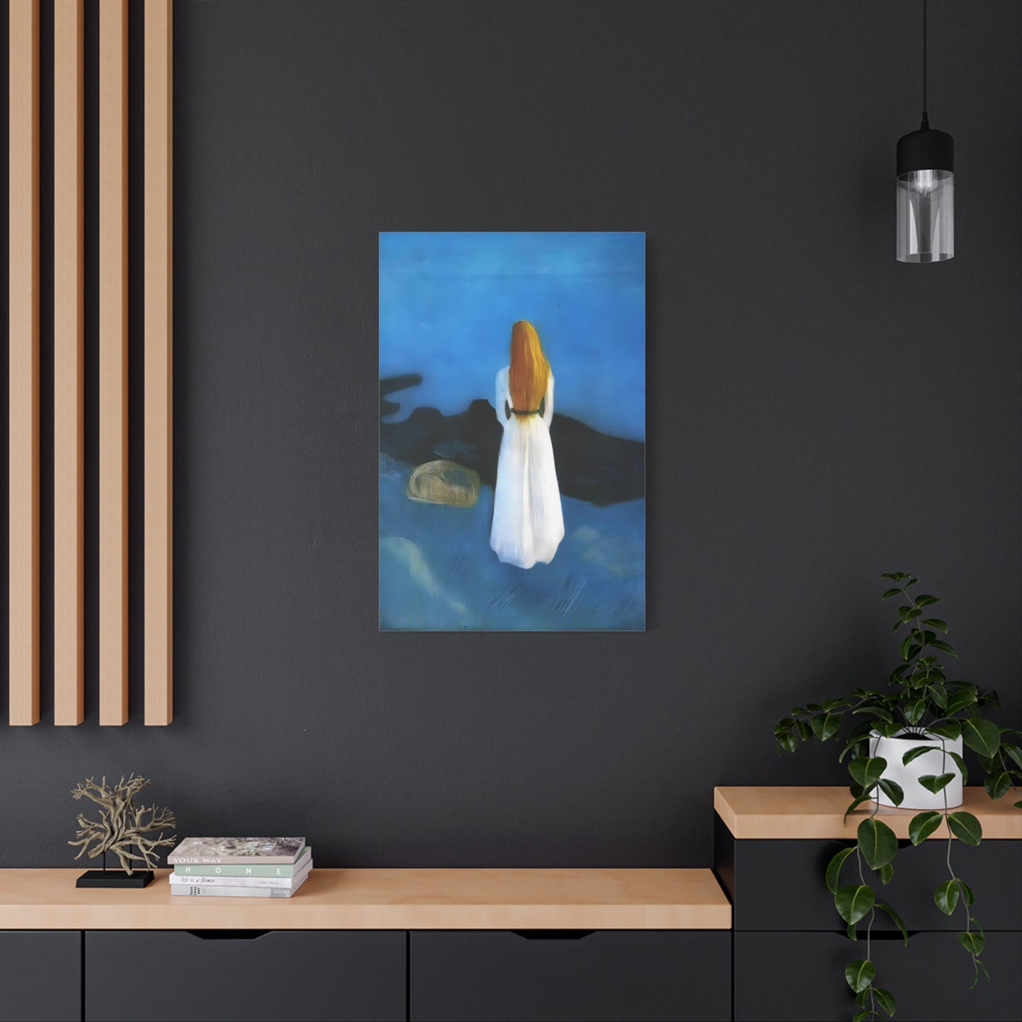 Immerse yourself in the captivating beauty of Young Woman on the Shore by the visionary artist Edvard Munch, painted in 1896. This enchanting masterpiece depicts a young woman standing on the shore, her figure radiating an air of mystery and contemplation. Munch's remarkable brushwork and the vibrant colors he employs transport you to a world of sublime tranquility, where the boundary between reality and imagination blurs. With every glance, you'll discover new depths within the artwork, unlocking a sense of curiosity and wonder. Let this mesmerizing piece grace your home, captivating your guests and serving as a source of inspiration, reminding you to embrace the profound beauty of life. Own a captivating replica of Young Woman on the Shore and embark on an extraordinary artistic journey, where imagination knows no bounds.