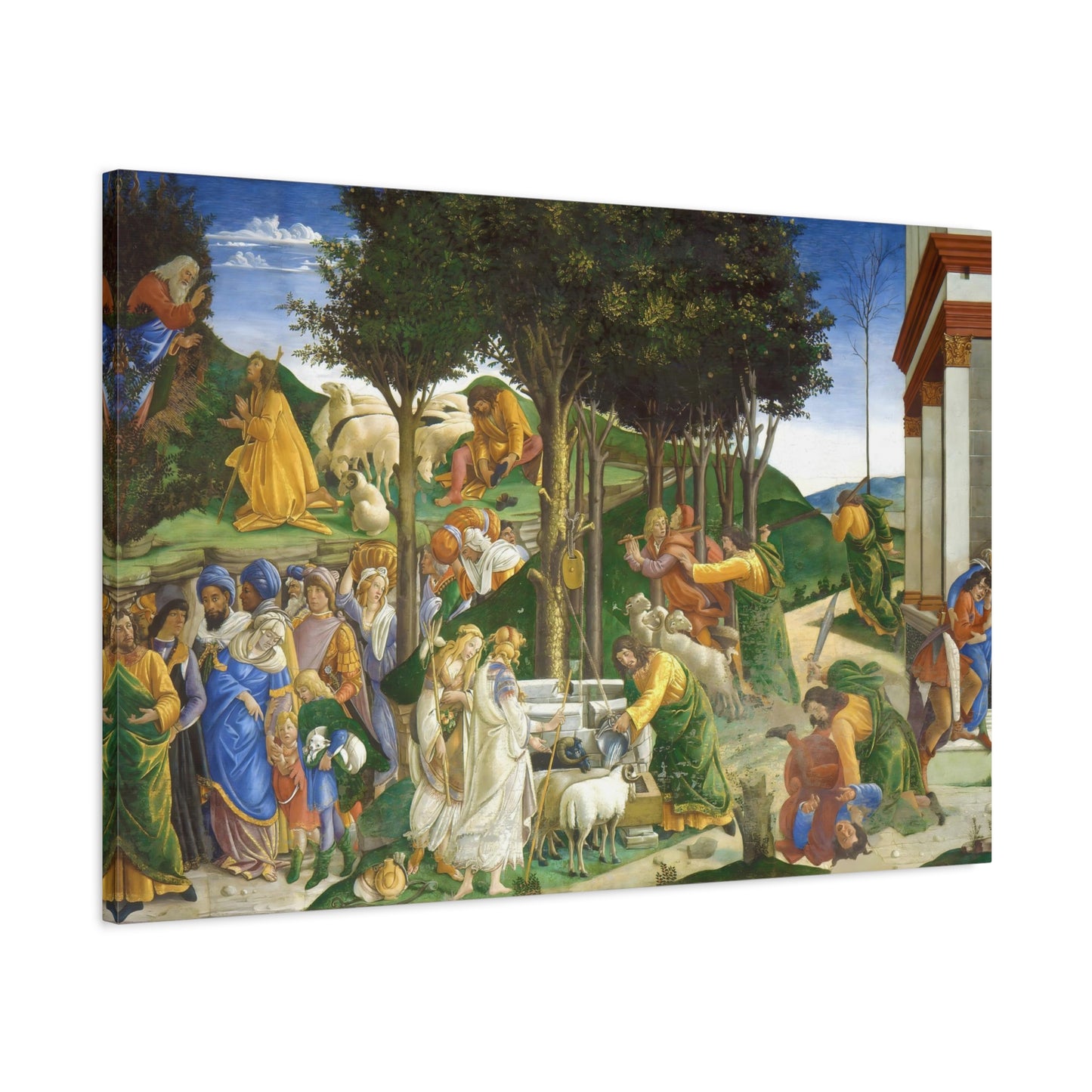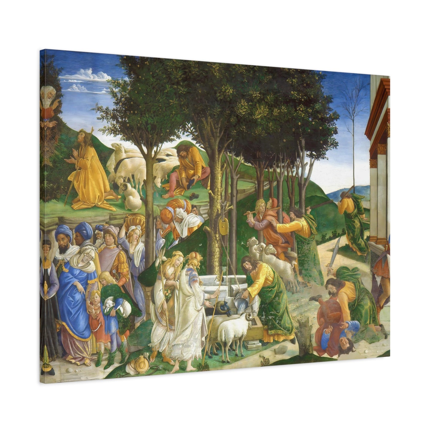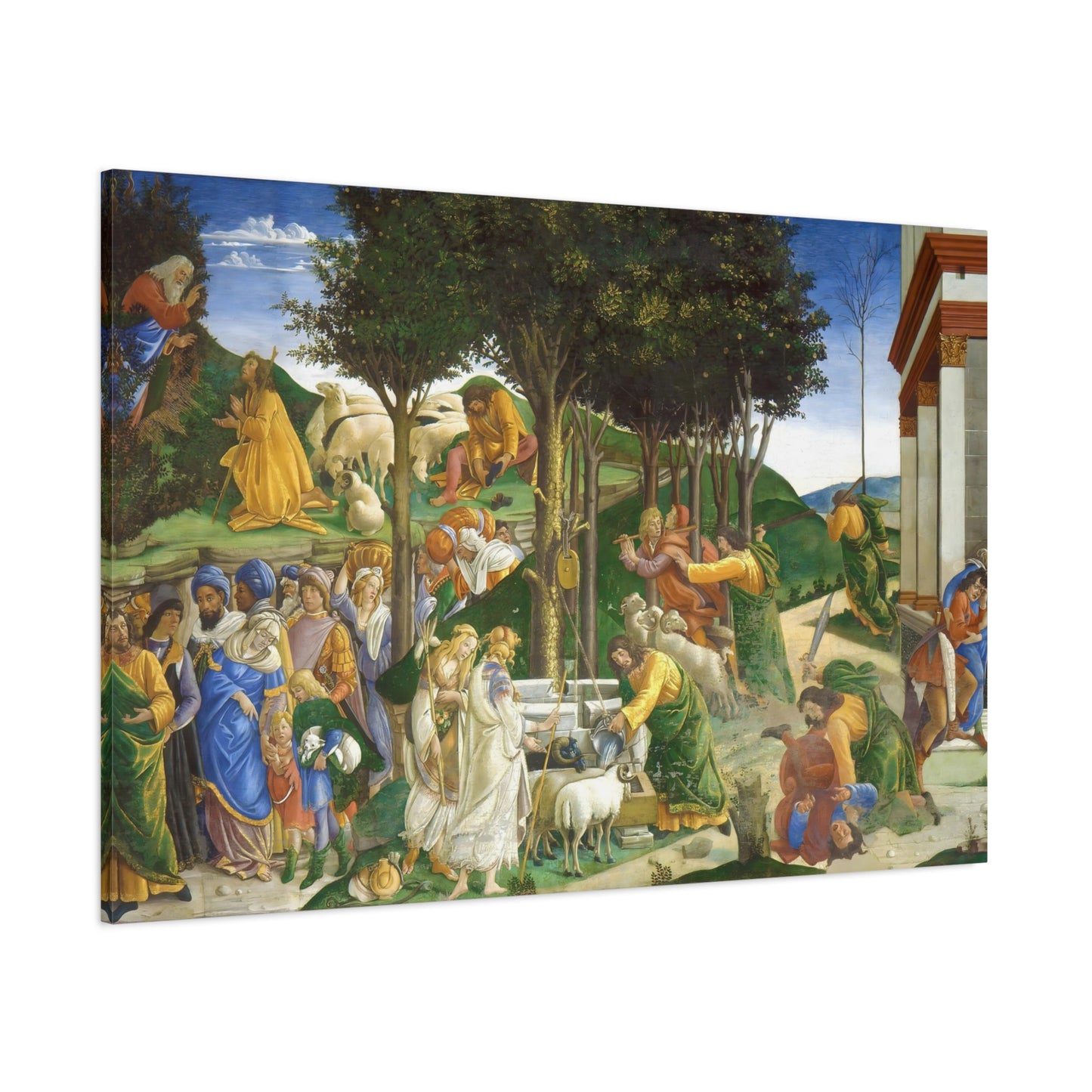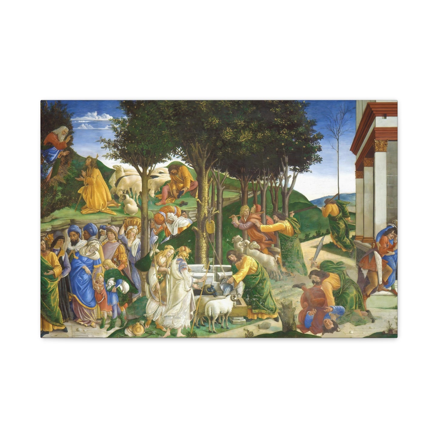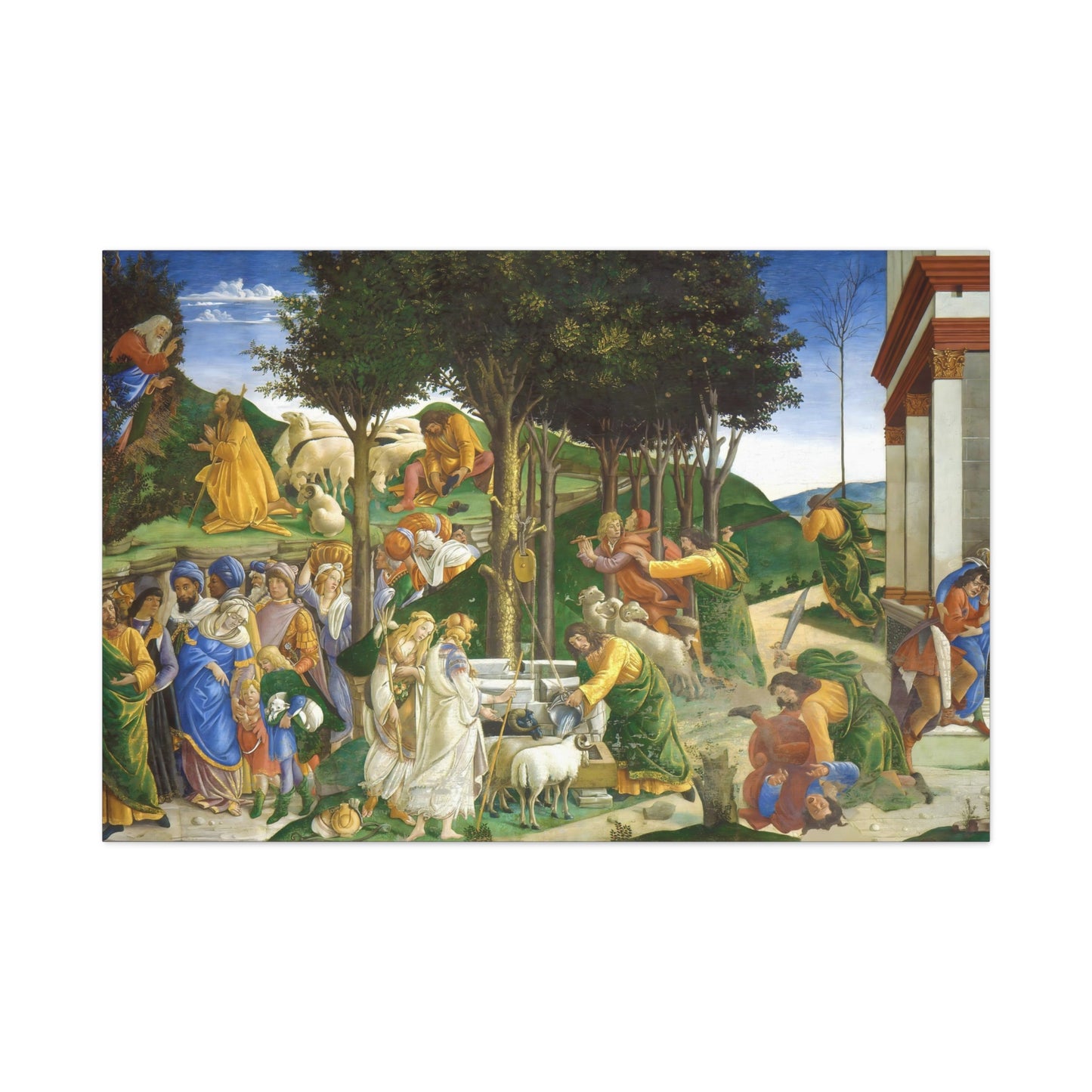 Immerse yourself in the captivating world of Sandro Botticelli's Youth of Moses, a stunning artwork created in the year 1482. This remarkable canvas art replication is a testament to Botticelli's mastery, showcasing his ability to capture the essence of a biblical narrative. With its rich colors, intricate details, and profound symbolism, this artwork will bring a touch of spiritual and historical significance to your home. Let the story of Moses's youth unfold before your eyes, as Botticelli's brushstrokes breathe life into the scene. Owning this masterpiece means owning a piece of art history, a visual treasure that will elevate the ambiance of your space and ignite conversations. Experience the power and beauty of Botticelli's work in your own home and let its timeless allure inspire and captivate you and your guests.